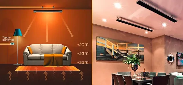 ІЧ обігрівачі поділяють на підлогові, настінні та стельові.