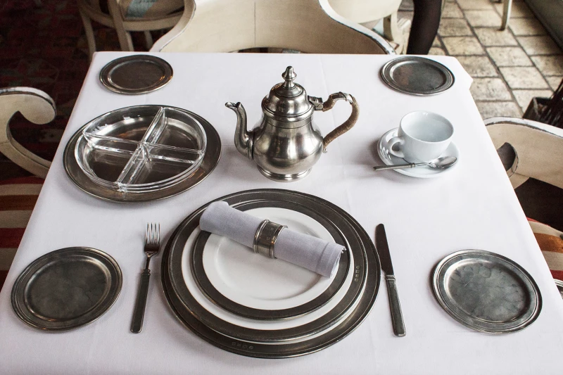 Із металу виготовляють ножі, ложки, виделки, каструлі, а також чашки та тарілки. Перевага — можливість підігріву на відкритому вогні чи електроплиті, довговічність, відсутність деформації.
