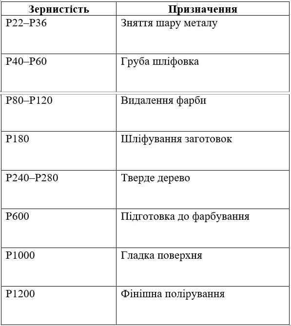 На оброблюваних поверхнях є дефекти? Тоді крупнозернистою наждачкою слід діяти спочатку. Надалі її можна буде замінити шкуркою з меншими зернами. Це потрібно не стільки для прискорення процесу, скільки для покращення якості робіт. У таблиці нижче наждачний папір види представлені матеріалами для восьми найменувань робіт. Там же відзначено: шліфшкурки з маркуванням понад Р1200 використовуються для тонкої шліфування металу. Для обробки дерев'яних поверхонь вони не підходять, оскільки не в силах створити потрібний ефект на пористих конструкціях.