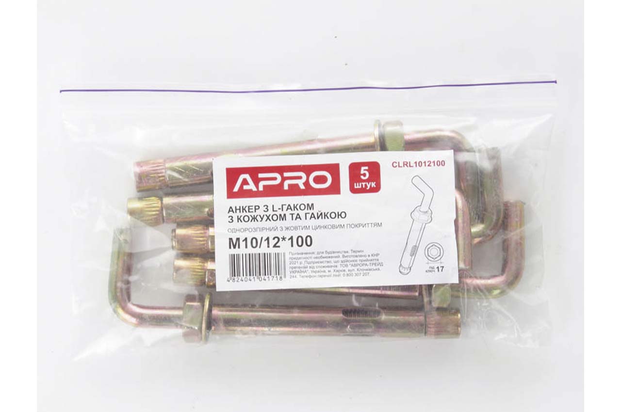 Анкер однораспорный с гайкой L-крюк Apro - 12 х 100мм x М10 (5шт)