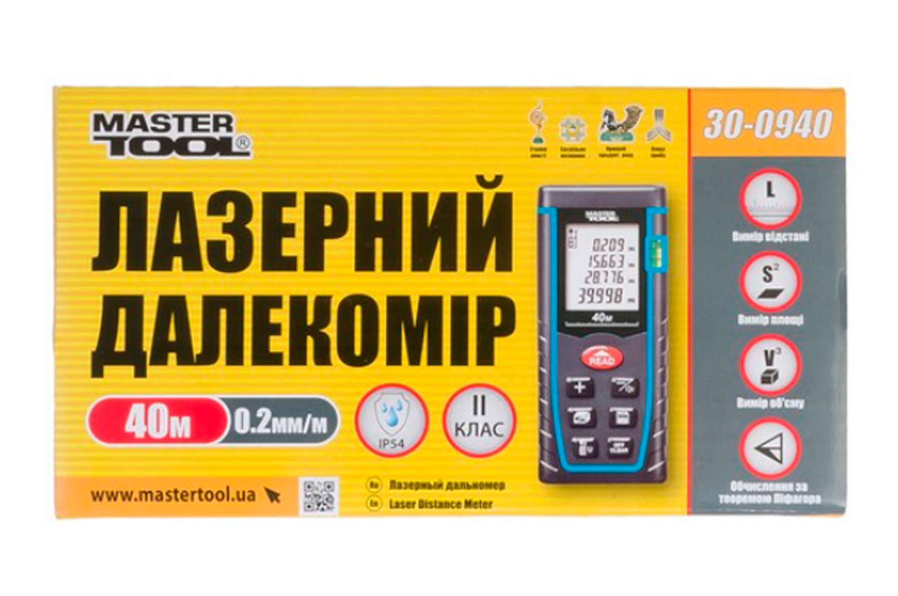 Рабочий диапазон: 0,05-40м высокая точность: ± 2 мм / м память на 30 значений класс лазера II уровень защиты: IP54 батарейки тип ААAx2 в комплекте.