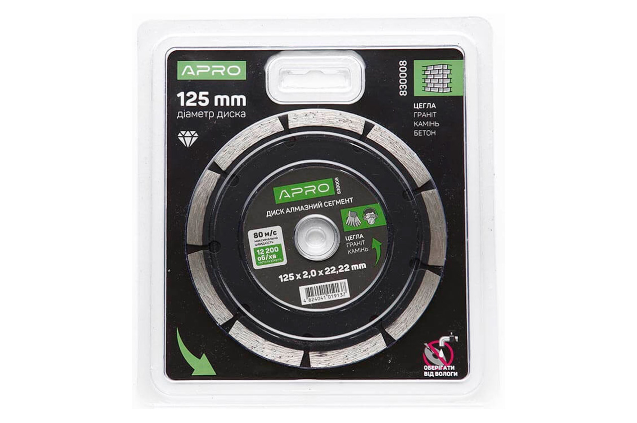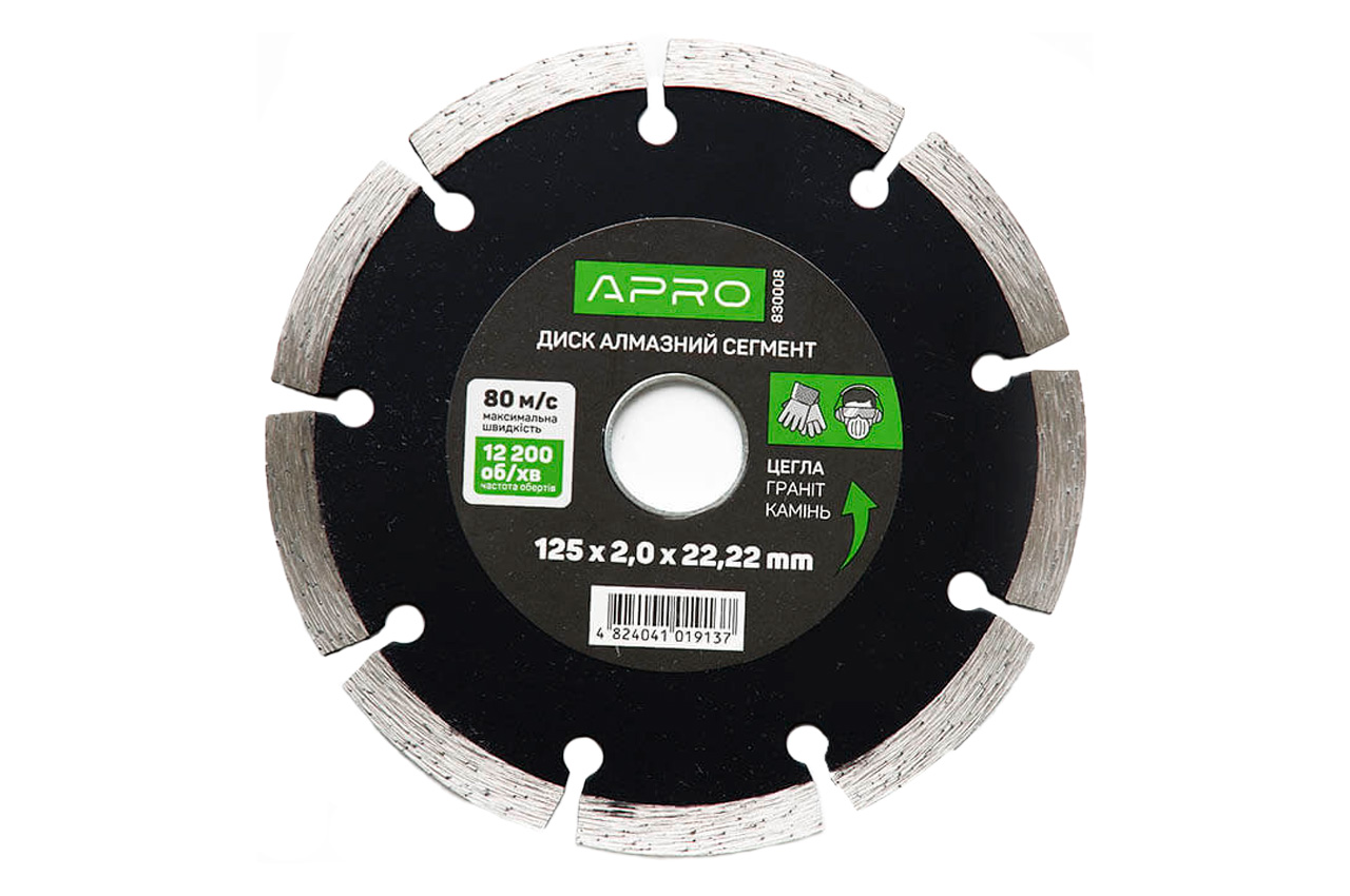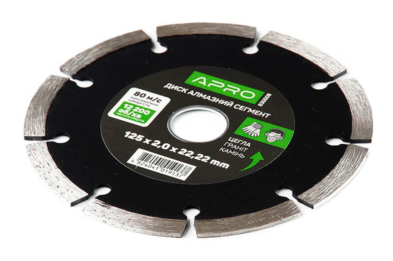 Алмазные диски для угловой шлифовальной машины (болгарки) предназначены для резки твердых видов бетона, камня и кирпича. Режущая поверхность сегментных дисков разбита на «секции» — они не только стачивают бетон алмазами, но и врезаются в него торцами. Пыль отводится через «зазор» между сегментами. При этом, тип резки можно использовать как сухой, так и мокрый, в зависимости от материала. Кроме того, отрезной круг сегментный можно использовать для умеренной резки гранита. Диаметр круга 125 мм