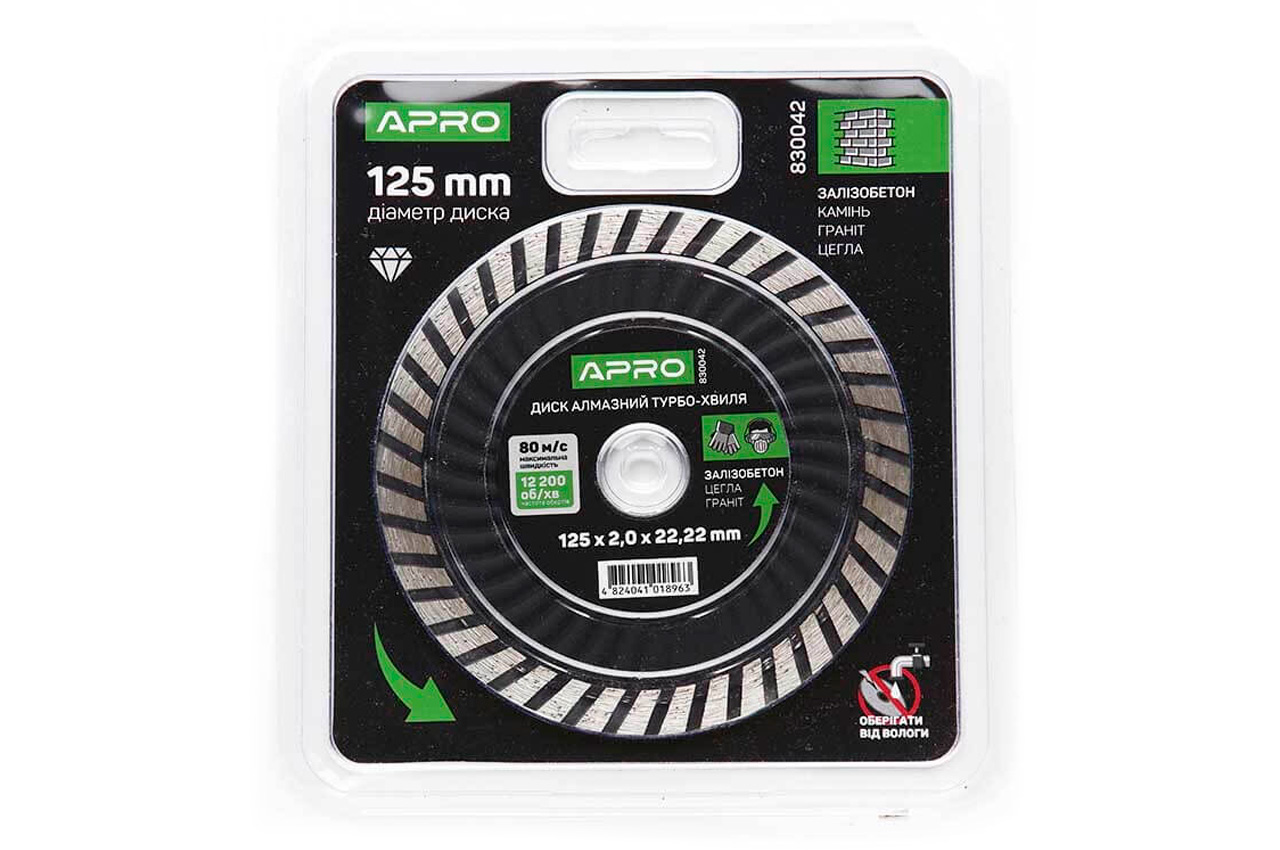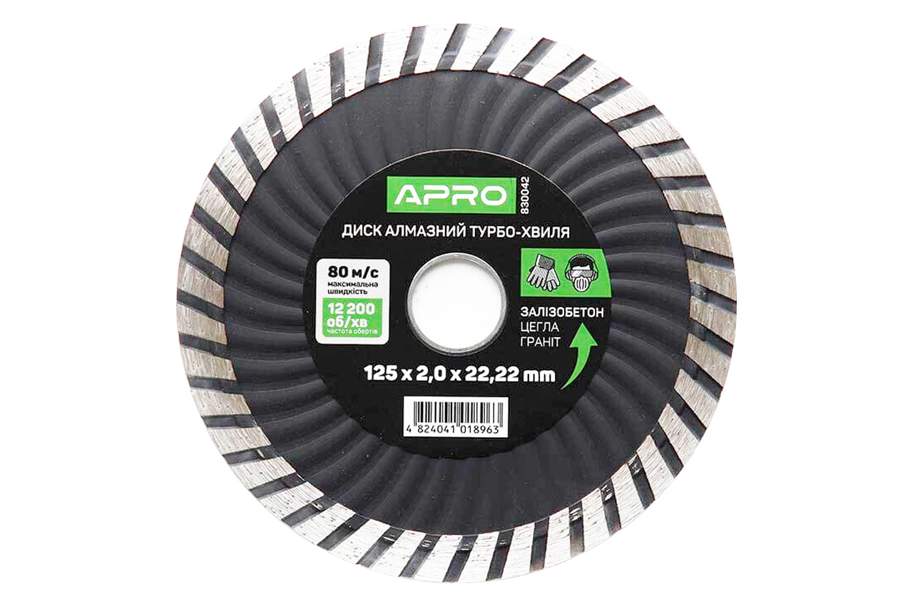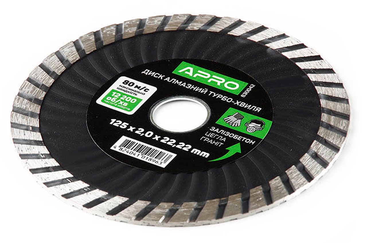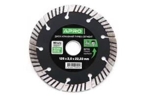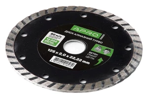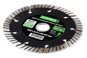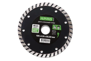 Диск алмазный по бетону Apro Турбо-волна предназначен для работы с камнем, бетоном, брусчаткой, гранитом и кирпичом. Волнистая форма режущего диска "TURBO" хорошо охлаждается воздухом, что позволяет использовать изделие для сухого реза. Внутреннее отверстие алмазного диска соответствует большинству присутствующих на отечественном рынке угловых шлифмашин. Высококачественный материал, из которого изготовлен диск гарантирует прочность и устойчивость к деформациям. Диаметр диска 125 мм