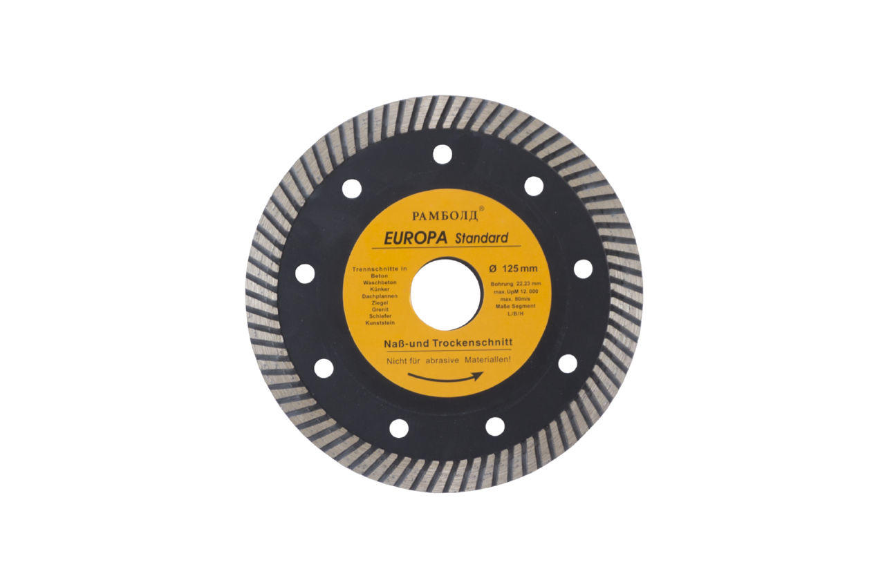 Диск алмазный Рамболд предназначен для разрезки бетона, армированного бетона, кирпича, тротуарной плитки и песчаника. Диаметр круга 125 мм.
