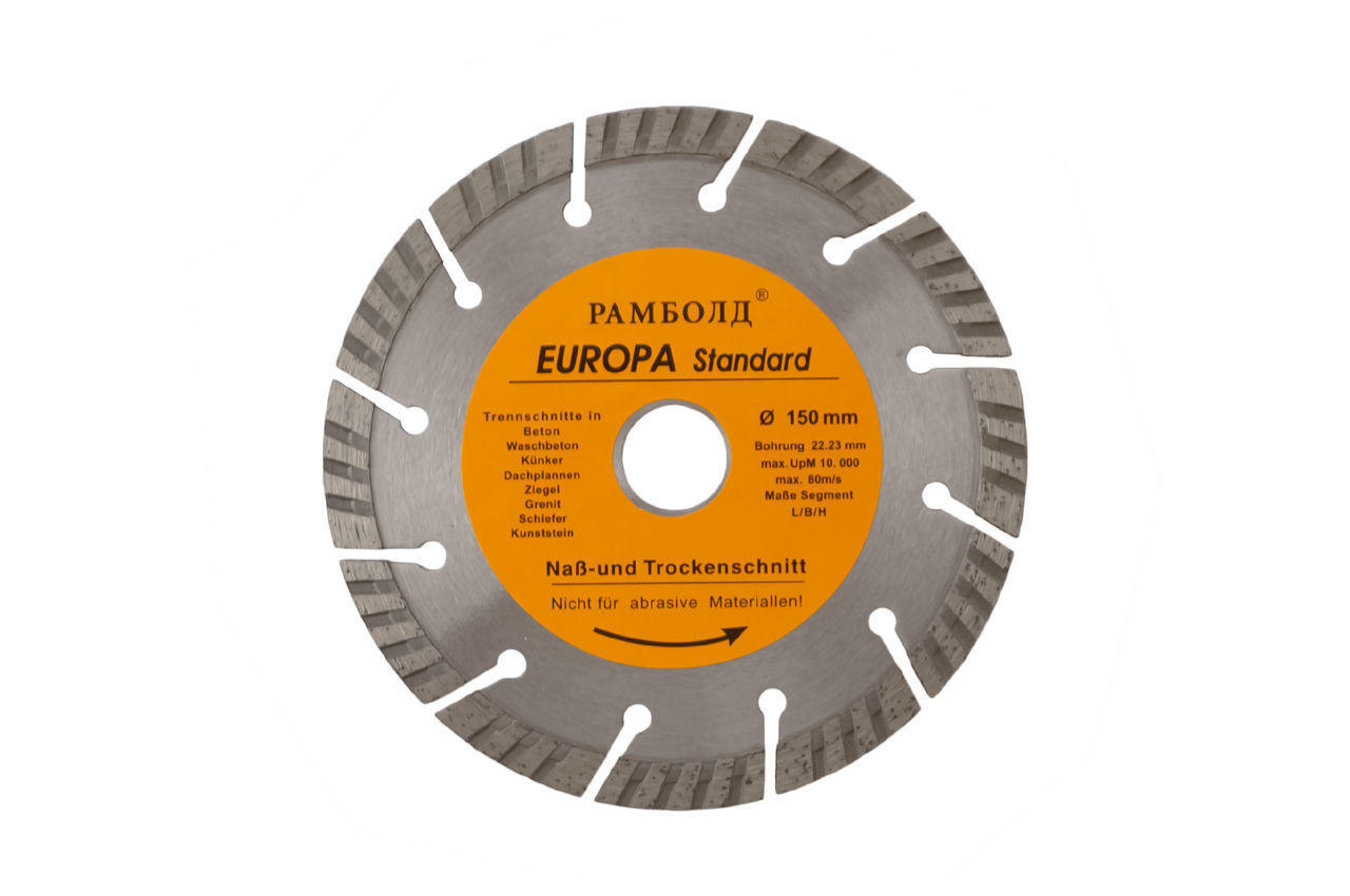 Алмазный диск "Рамболд" предназначен для сухой резки строительных материалов, таких как бетон, кирпич, камень, гранит, огнеупорный материал. Используется на УШМ, ручном электрическом плиткорезе, штроборезе. Состоит из алмазных сегментов и стального корпуса. Имеет уникальную функцию самозатачивания. Диаметр диска 150 мм. Размер отверстия 22,2 мм.