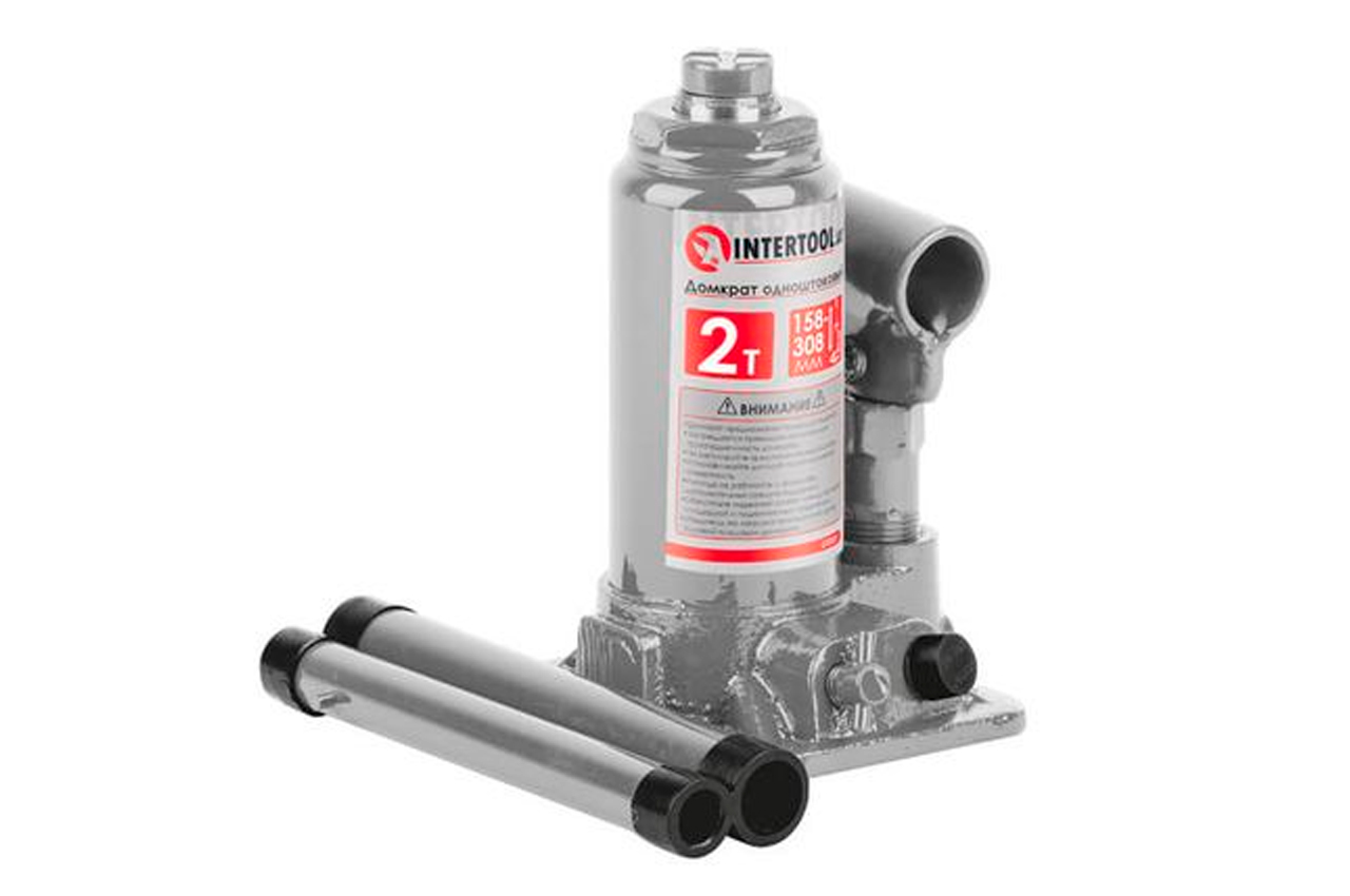 Домкрат бутылочного типа "столбик" предназначен для различных монтажных, строительных работ, пригодится везде, где необходимо поднять груз. Подходит для подъема автомобилей и прочего тяжелого груза, весом до 2 тонн. Высота подхвата составляет - 158 мм. Это расстояние от опорной площадки домкрата (дороги) до подхвата (подъёмной пятки домкрата) в его нижнем рабочем положении. Минимальная высота подхвата не должна превышать клиренс поднимаемого автомобиля. Максимальная высота подъёма с вывернутым винтом - 308 мм. Максимальная грузоподъемность до 2 тонн.