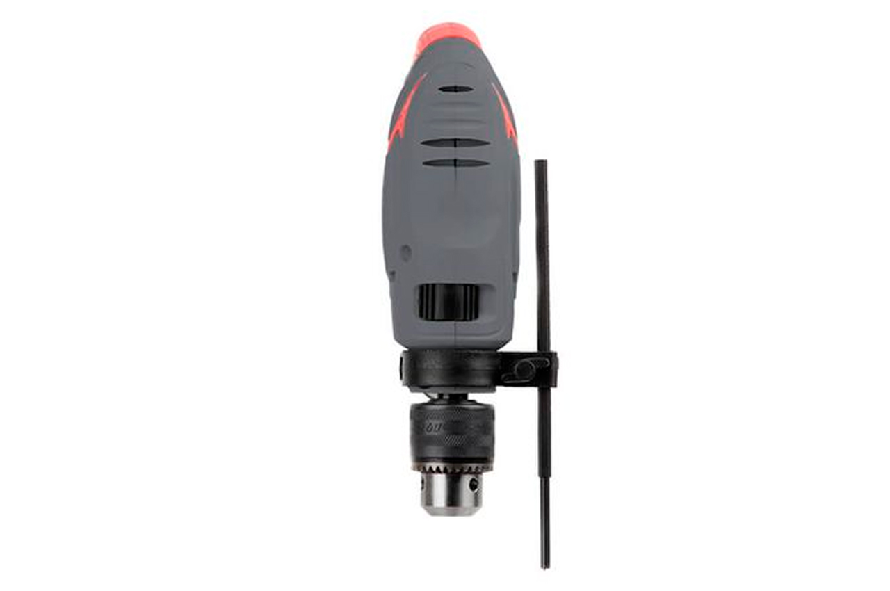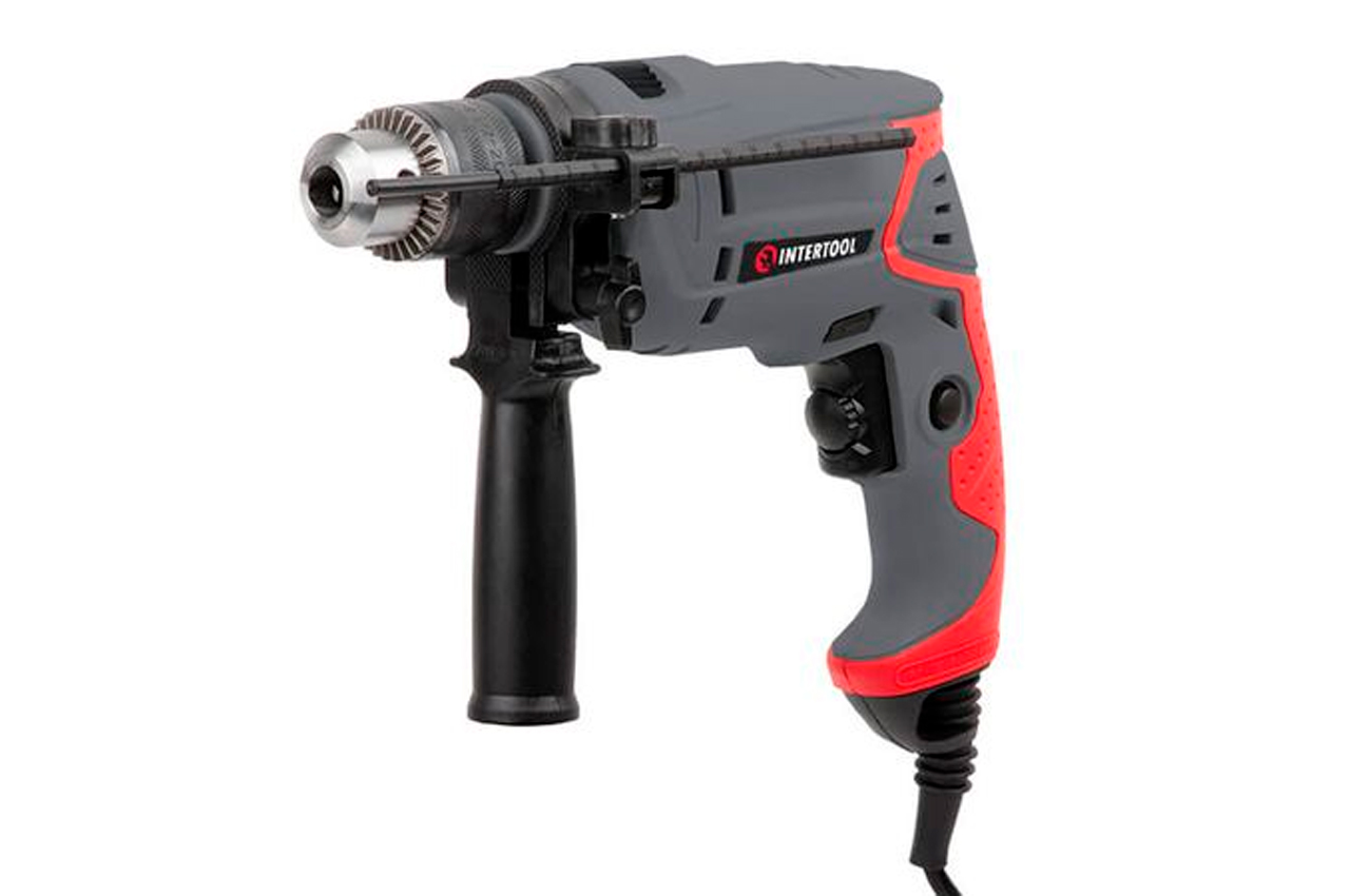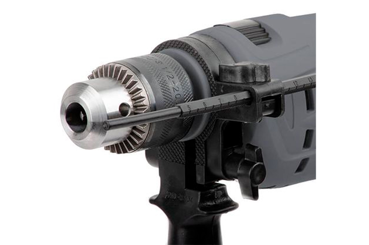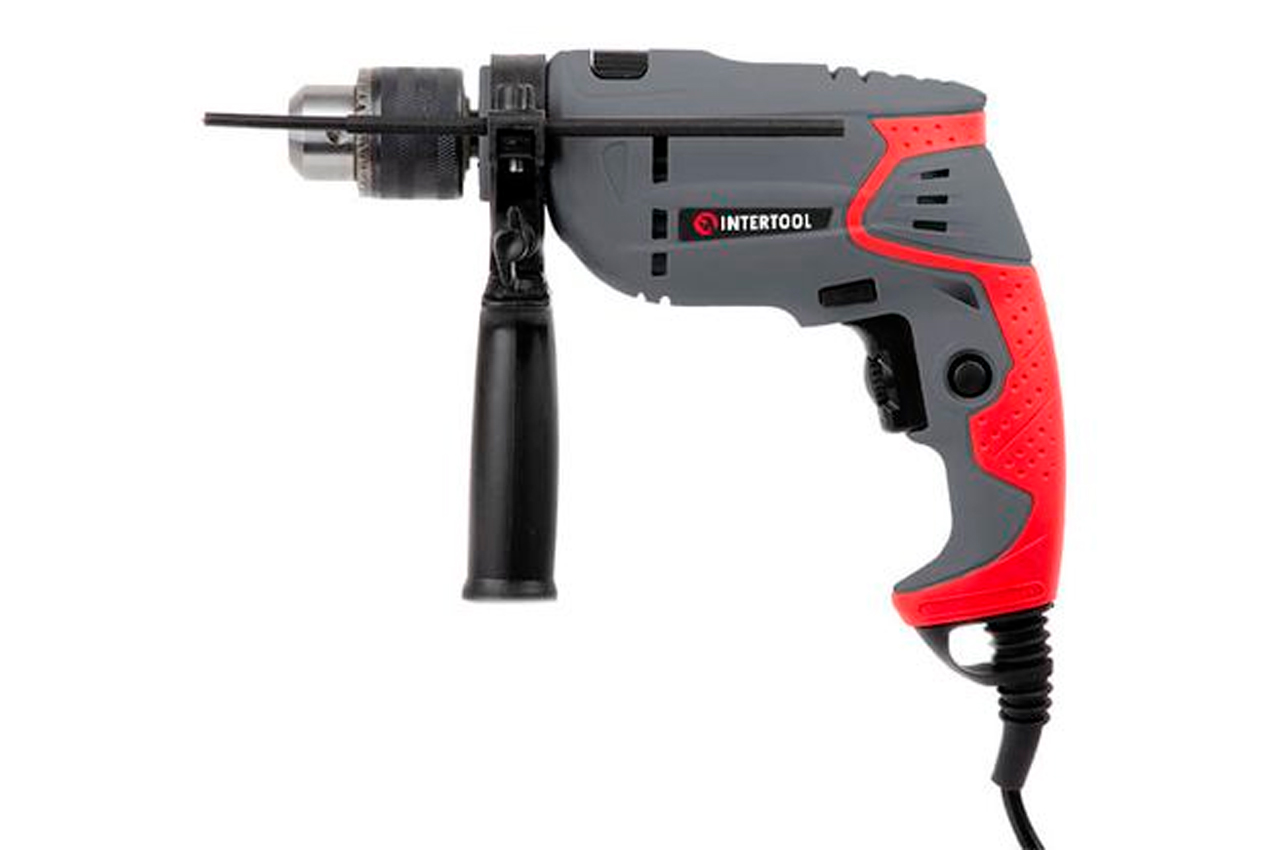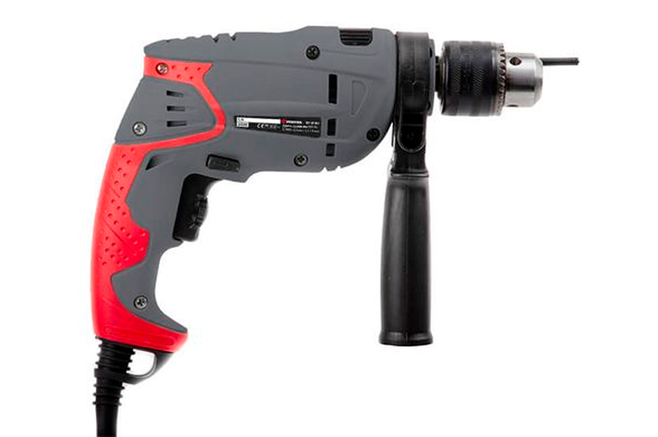 Компактная ударная дрель DT-0107 – незаменимый инструмент для любого домашнего мастера. Назначение ударной дрели – сверление отверстий в материалах, таких как: дерево, сталь, кирпич с максимальным диаметром отверстия до 13 мм. Дрель DT-0107 питается от бытовой сети напряжением 230 В, имея при этом, электродвигатель мощностью 550 Вт. Электродвигатель развивает максимальное количество оборотов холостого хода до 2700 об/мин. Дрель оснащена дополнительной боковой рукояткой, которая может проворачиваться. Провод питания имеет резиновое ушко, в котором фиксируется ключ для зажима патрона. Т.е. в случае необходимости замены сверла, ключ всегда будет «под рукой». Основная рукоятка дрели имеет резиновую накладку. Напряжение питания: 230 В; Потребляемая мощность: 550 Вт; Количество скоростей: плавная регулировка; Скорость вращения: 0-2800 об/мин; Максимальный диаметр сверления: сталь: 10ммкирпич: 13ммдерево: 20мм; Наличие реверса: да; Патрон: 1,5-13 мм; Резьба шпинделя: 1/2" х 20 UNF
