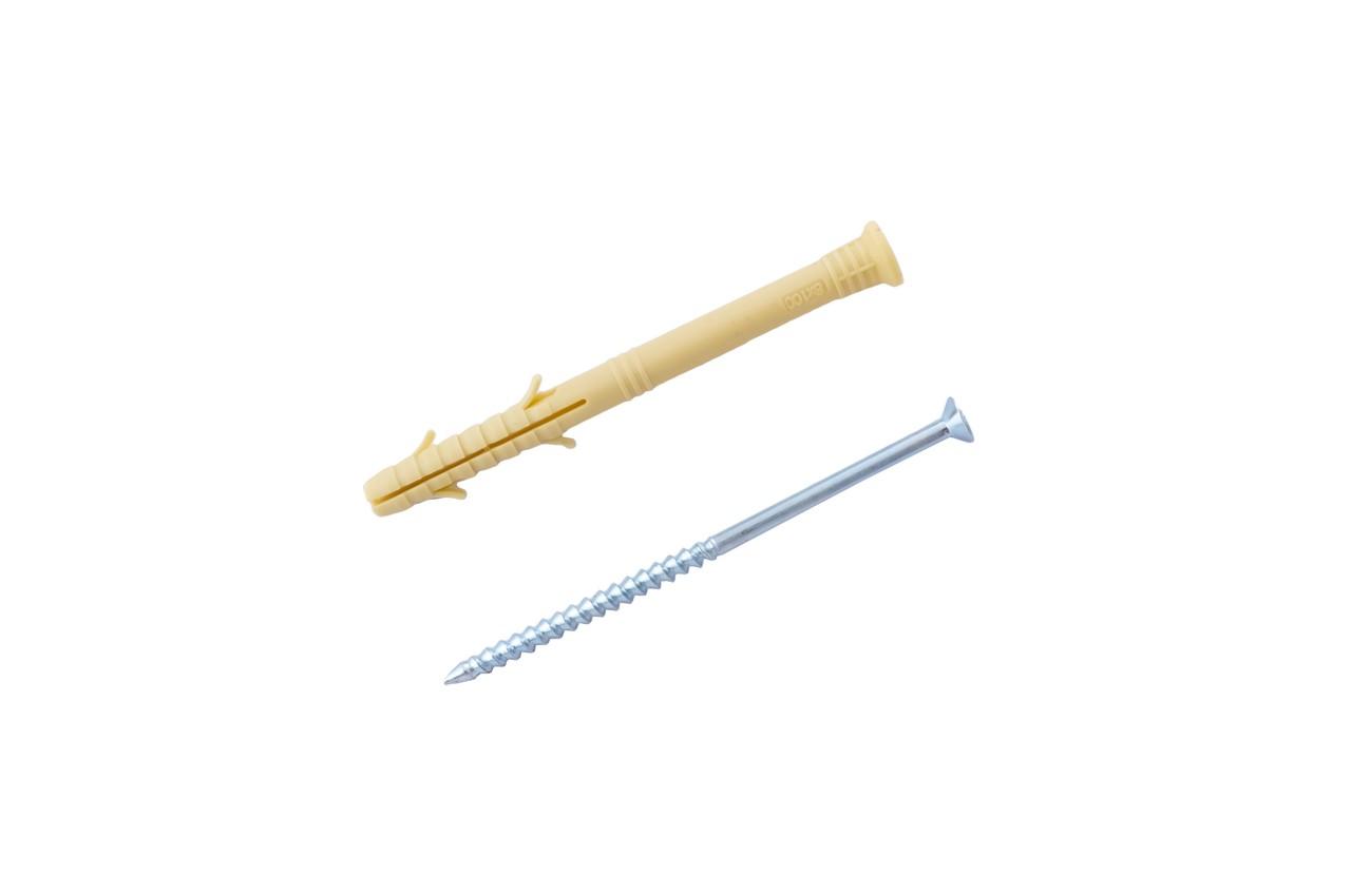 Дюбель-гвоздь Apro имеет широкую область применения. С его помощью можно собирать конструкции из профилей и уголков, а также фиксировать листовые материалы (гипсокартон, пенополистирол, ДВП, ДСП и др.). Дюбель прекрасно сочетается с бетонными, кирпичными, каменными, гипсовыми и деревянными основаниями. Этот крепеж состоит из пластикового дюбеля и забивного шурупа.