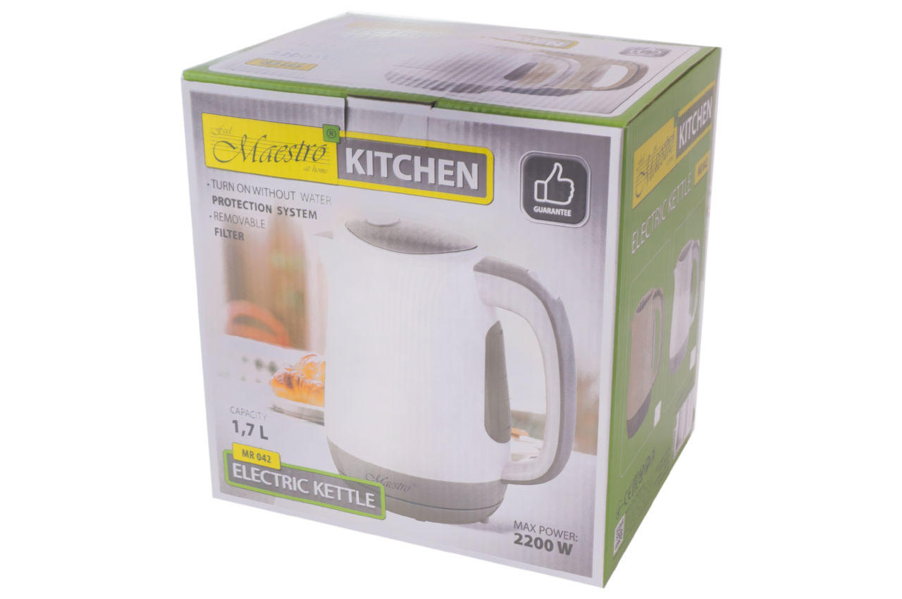 Електрочайник Maestro-MR-042 недорога функціональна модель для дому. Індикатор рівня води дозволить візуально контролювати об'єм та доливати воду за необхідності до потрібної позначки. Кришка відкривається лише натисканням кнопки. Показник потужності 2200 Вт не перевищує можливості електромережі, на відміну від потужніших моделей. Термостійкий пластиковий корпус не нагрівається, тому ризик отримати опік рук виключено. Об'єму в 1,7 літра вистачить для чаювання великої родини та гостей. Плоский нагрівальний елемент, який прихований під корпусом, кип'ятить воду набагато швидше, ніж моделі з ТЕНами. Захист від перегріву спрацює, якщо ви випадково забули долити в чайник води.