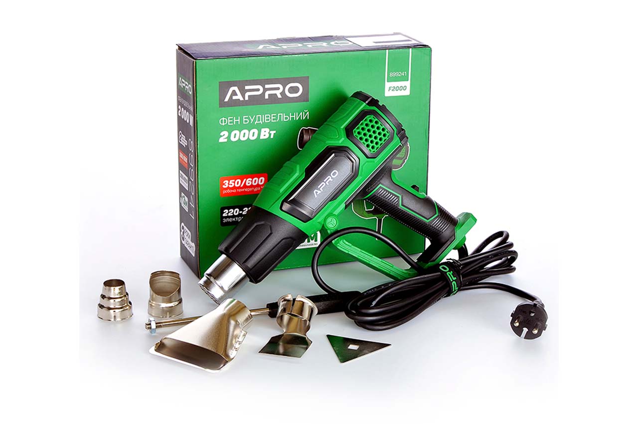Промышленный фен APRO F2000 мощностью 2000 Вт представляет собой электронагревательный прибор широкого применения. Под действием данного устройства размораживаются водосточные трубы, удаляется старая краска. Технический фен способен очистить поверхность от загрязнений, помочь при разжигании угля в мангале. Мощность устройства составляет 2000 Вт. Температуру воздуха можно регулировать посредством переключения режимов (от 350 до 600 градусов Цельсия). Воздух также можно выбирать: от 300 до 600 литров в минуту.
