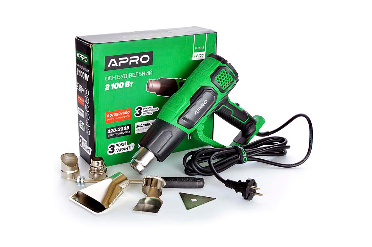 Фен промышленный APRO F 2100, 3 режима 2100 Вт значительно упрощает жизнь искусного хозяина. Ведь сфера применения Электрофены очень велика. Под действием данного устройства размораживаются водосточные трубы, удаляется старая краска. Технический фен способен очистить поверхность от загрязнений, помочь во время растопки угля в мангале. Мощность устройства составляет 2100 Вт. Температуру воздуха можно регулировать с помощью переключения режимов (до 600 градусов Цельсия). Поток воздуха можно выбирать: до 600 литров в минуту.