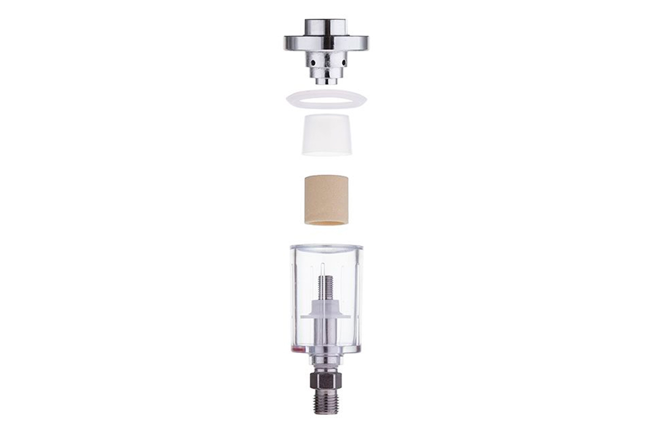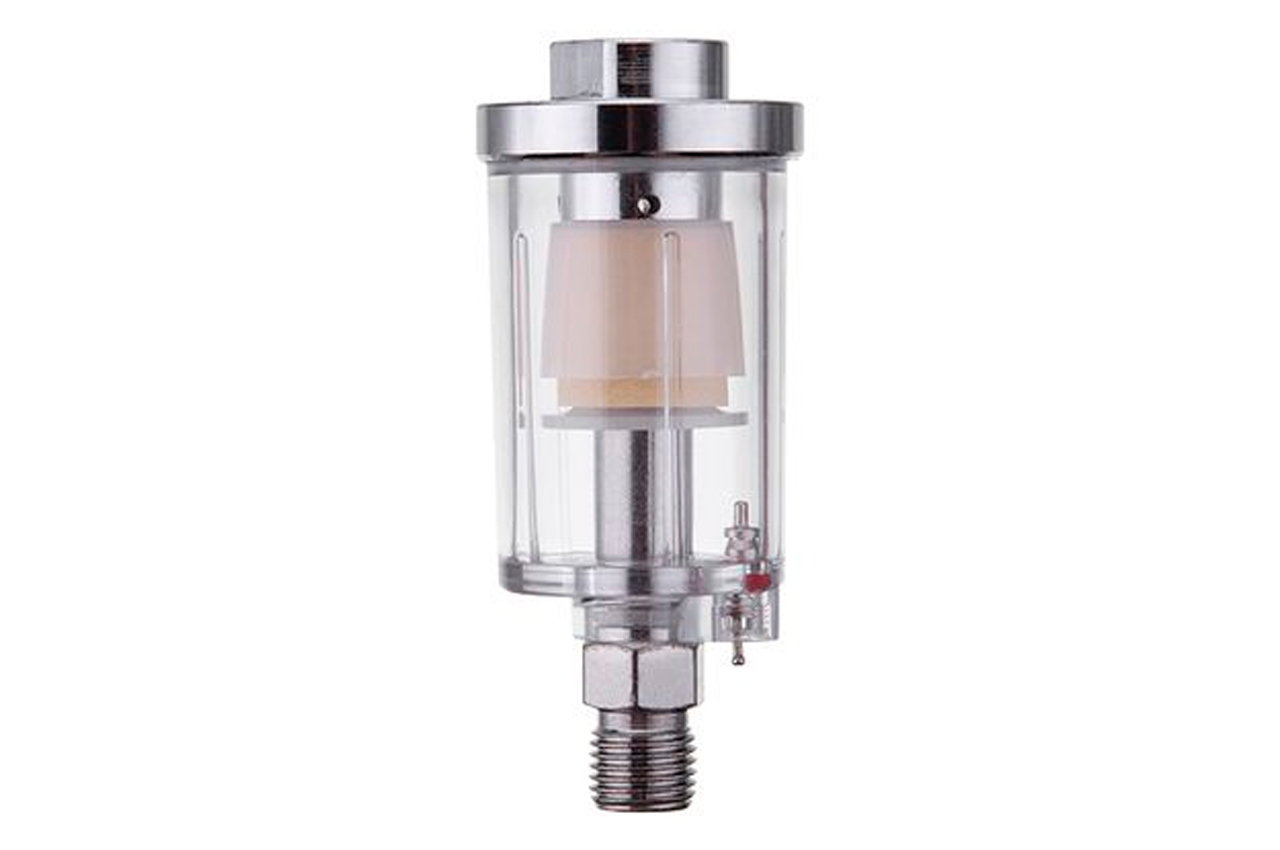 Мини фильтр необходим для очистки сжатого воздуха непосредственно перед входом в пневмоинструмент. Резьбовые соединения 1/4". Рабочее давление до 10 атмосфер. Фильтр оснащен сливным клапаном. Особенности Фильтрующий элемент изготовлен из вспененного металла – многоразового материала; Монтируется напрямую перед краскопультом, без переходников; Прочный - верхнее и нижнее основание мини-фильтра выполнено из металла. Уровень фильтрации: до 5 мкм; Пропускная способность: до 400 л/мин; Диаметр шланга: 6-8 мм; Диаметр резьбы: 1/4"