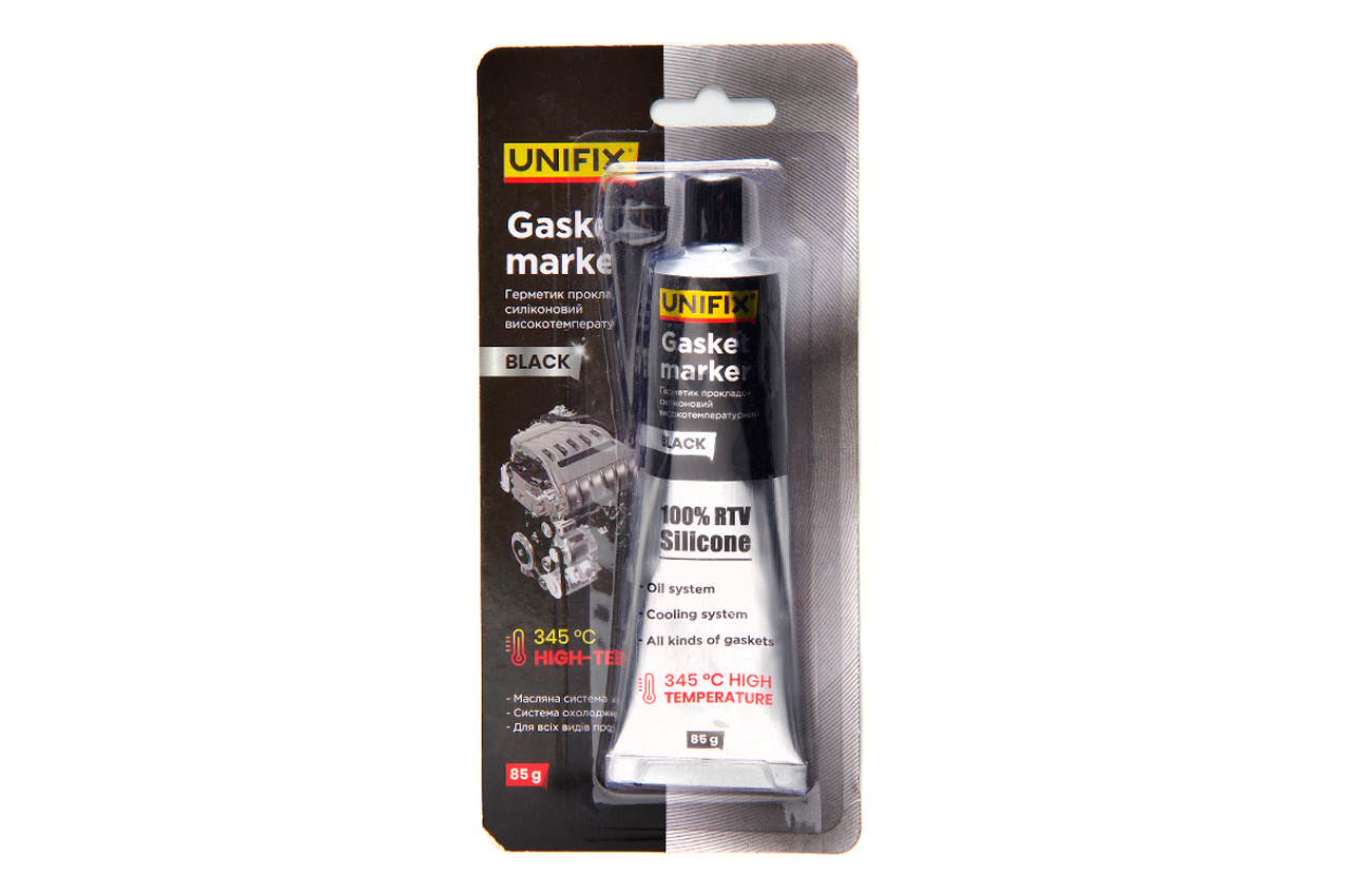 Герметик прокладок Unifix - 85г x 345°С черный предназначен для ремонта и замены прокладок, используемых при высоких температурах от -70 до + 345°С. 100% Натуральный силикон, устойчивый к автомобильным жидкостям. Безопасен для электронных датчиков. Сохраняет гибкость и эластичность после высыхания.
