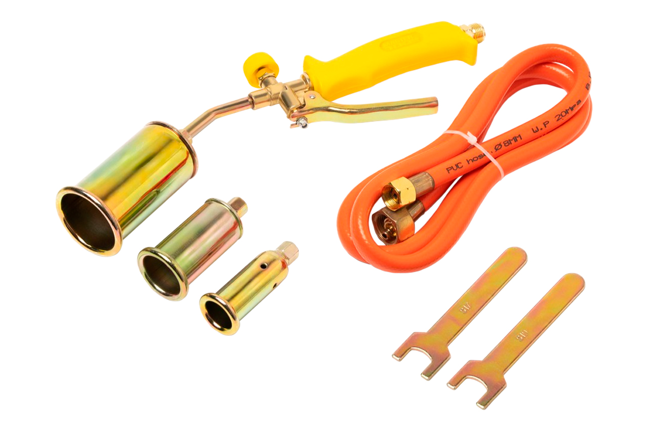 Горелка ручная газовоздушная с насадками Ø 22/35/50 мм — универсальный инструмент для мощного нагрева. Эта многофункциональная горелка оснащена тремя сменными насадками (Ø 22 мм, 35 мм и 50 мм), что позволяет адаптировать инструмент к различным задачам. Общая длина 400 мм обеспечивает комфортную и безопасную работу. Высокая тепловая мощность 53 кВт и максимальная температура до 1300°C гарантируют эффективное выполнение даже самых сложных задач.