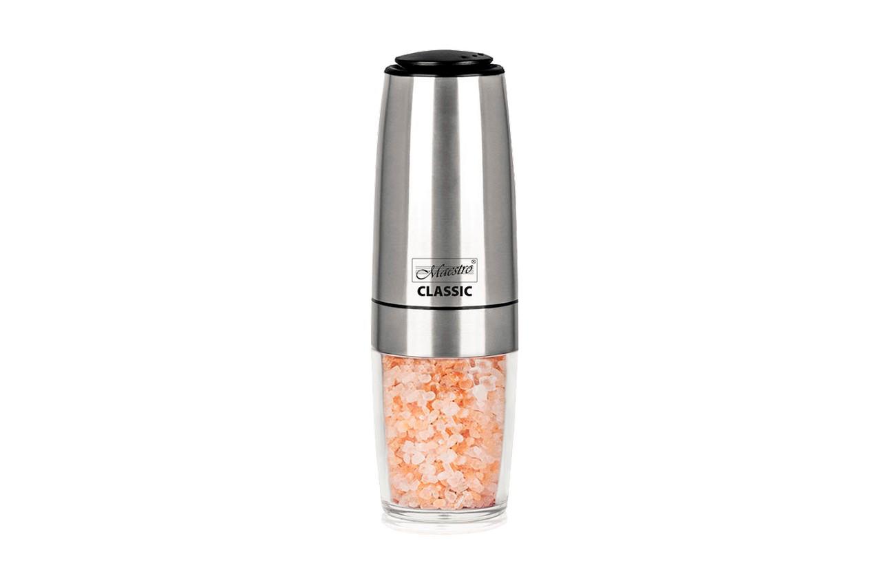 Электрический измельчитель для соли и перца Maestro - поможет быстро добавить в блюдо соль, перец или любые другие пряности. Изготовлено из нержавеющей стали и металла, которые гарантировано прослужат долгие годы. Механизм электрический и удобный. Элегантный дизайн впишется в современный интерьер кухни или праздничную сервировку стола. Небольшая часть выполнена из стекла, поэтому видно, что находится внутри.