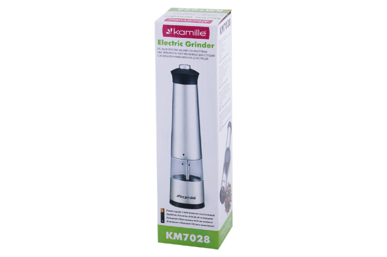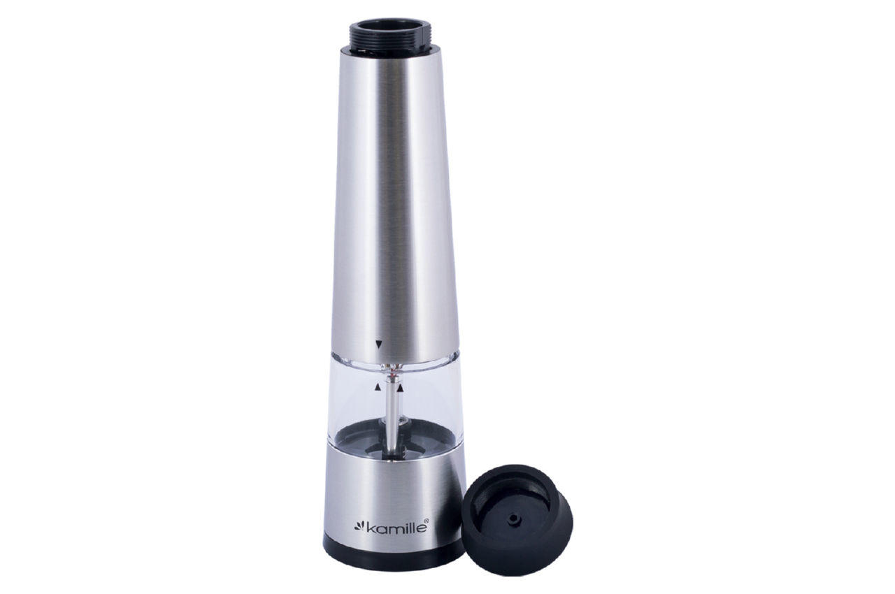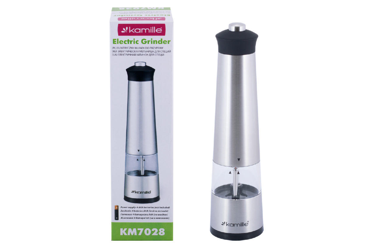 Измельчитель для специй электрический Kamille – электрическая мельница для перца (перцемолка), для большой соли и других специй. Классическая форма в современном исполнении. Питание – 4 батарей ААА.