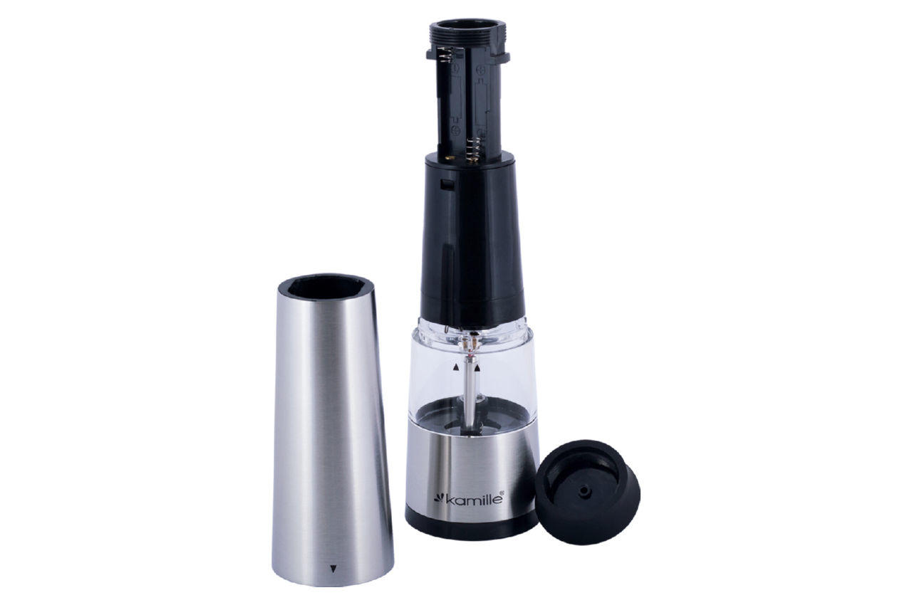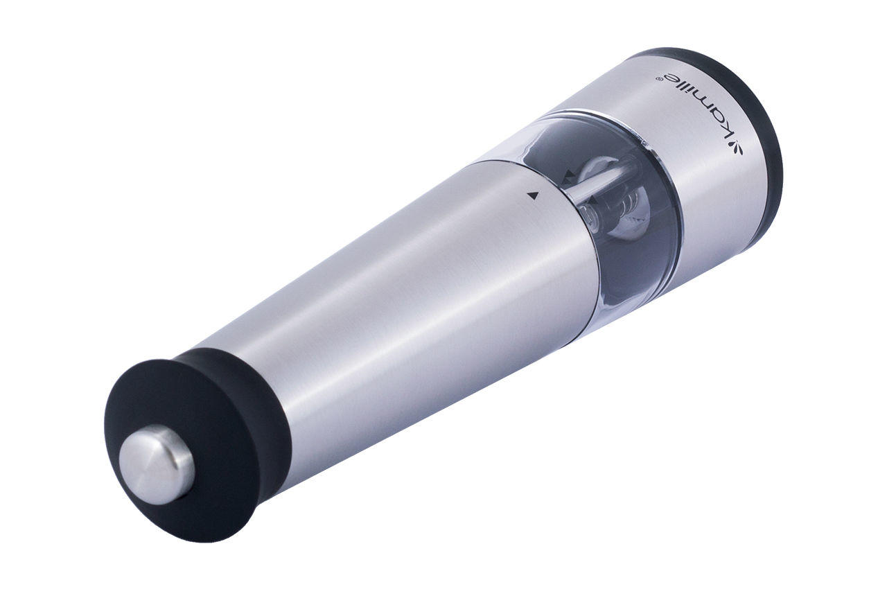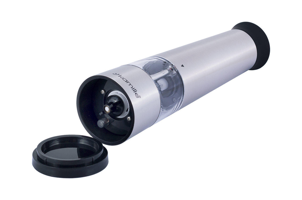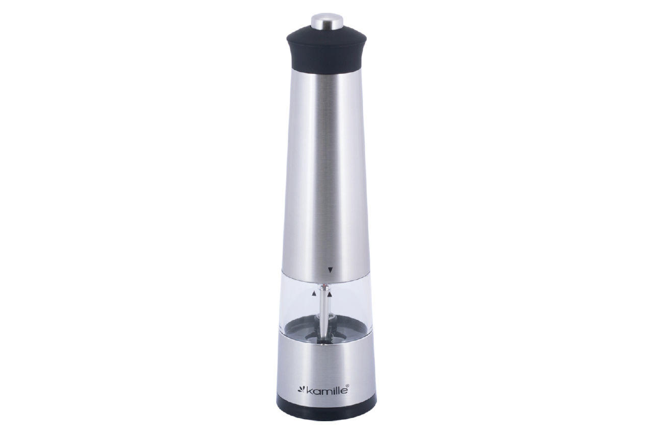 Измельчитель для специй электрический Kamille – электрическая мельница для перца (перцемолка), для большой соли и других специй. Классическая форма в современном исполнении. Питание – 4 батарей ААА.