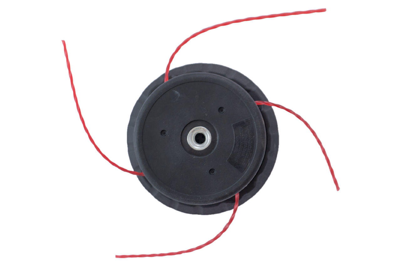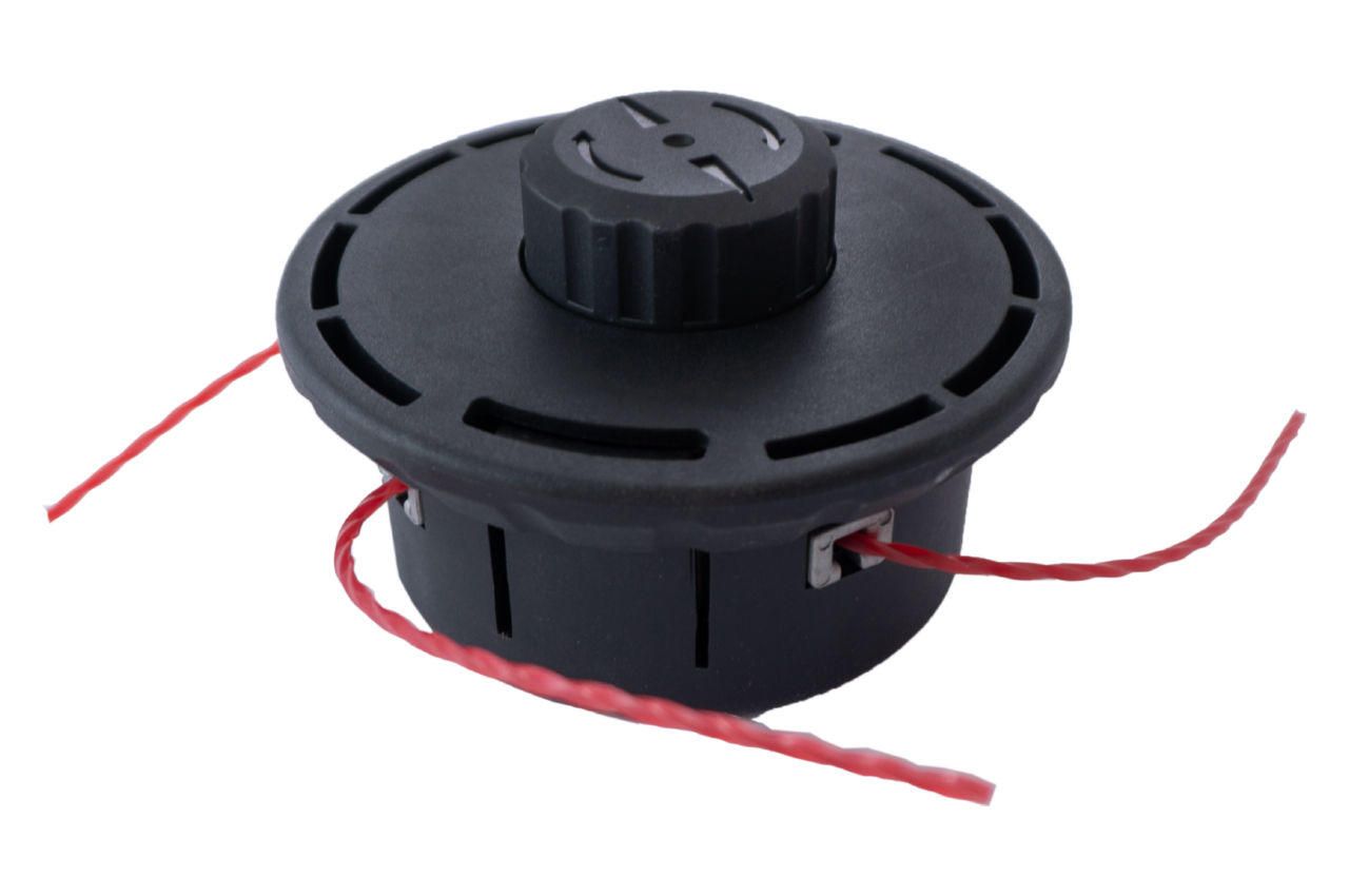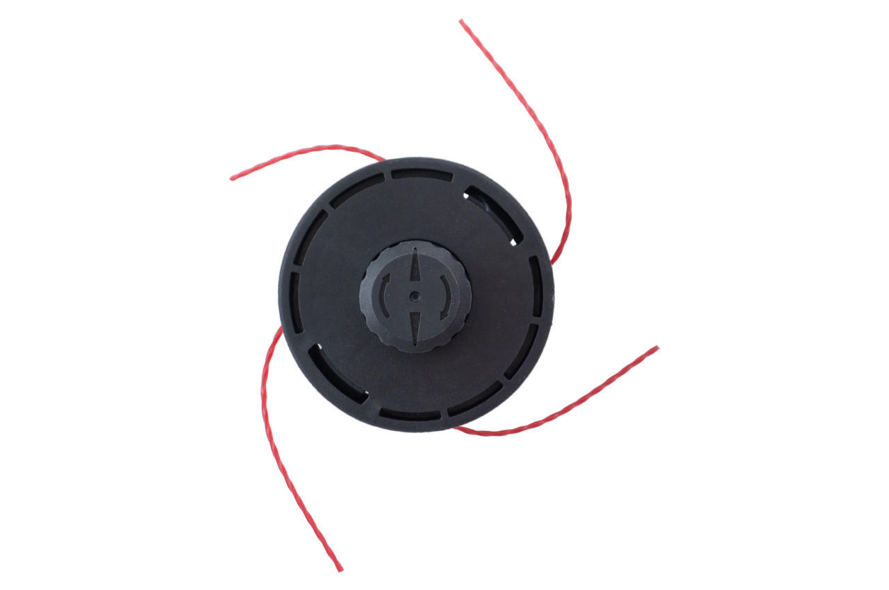 Катушка для триммера автоматическая. Для обновления лески ее не надо разбирать. Достаточно отрезать кусок нужной длины, продеть его через катушку, предварительно совместив отверстие для лески со стрелкой на триммерной головке. Далее совмещают два конца, чтобы выровнять их по длине, а затем наматывают леску, прокручивая головку. Плотность намотки равномерная, за этим следит несложный механизм.