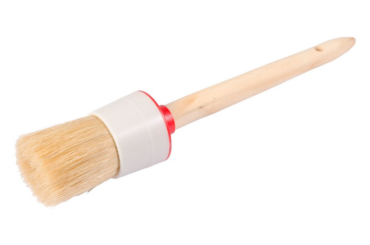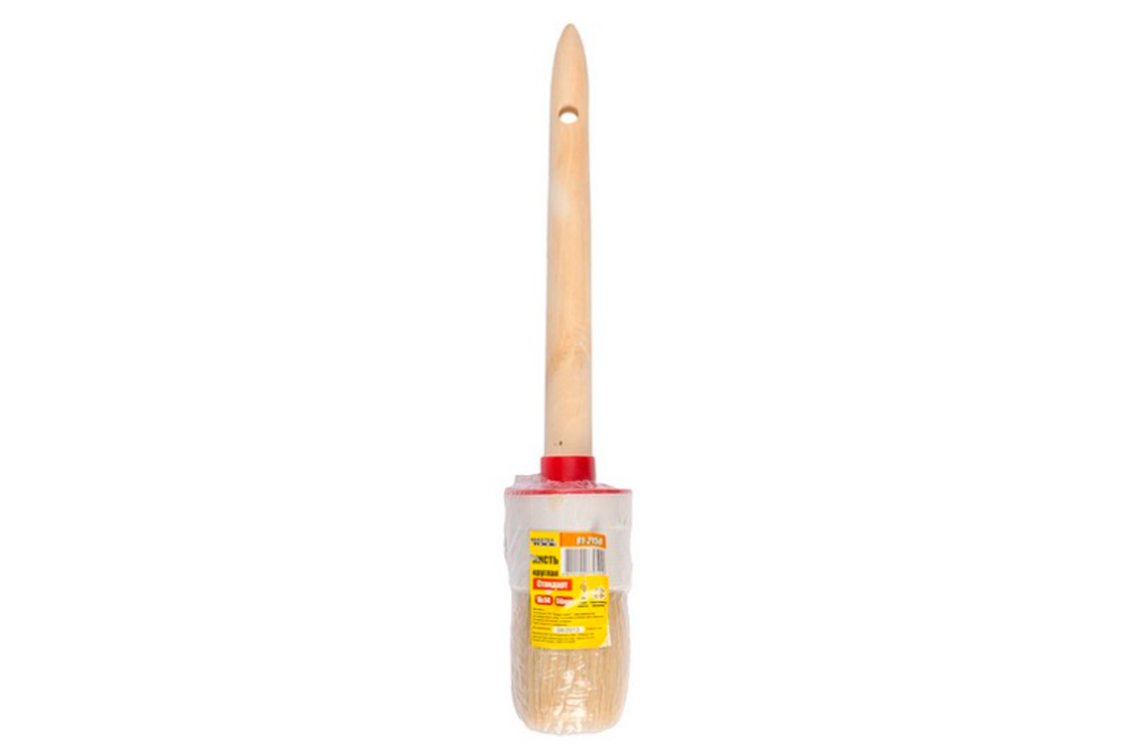 Предназначена для работ со всеми видами лакокрасочных материалов. Имеет деревянную ручку и светлую натуральную щетину, закрепленную пластиковым бандажом.