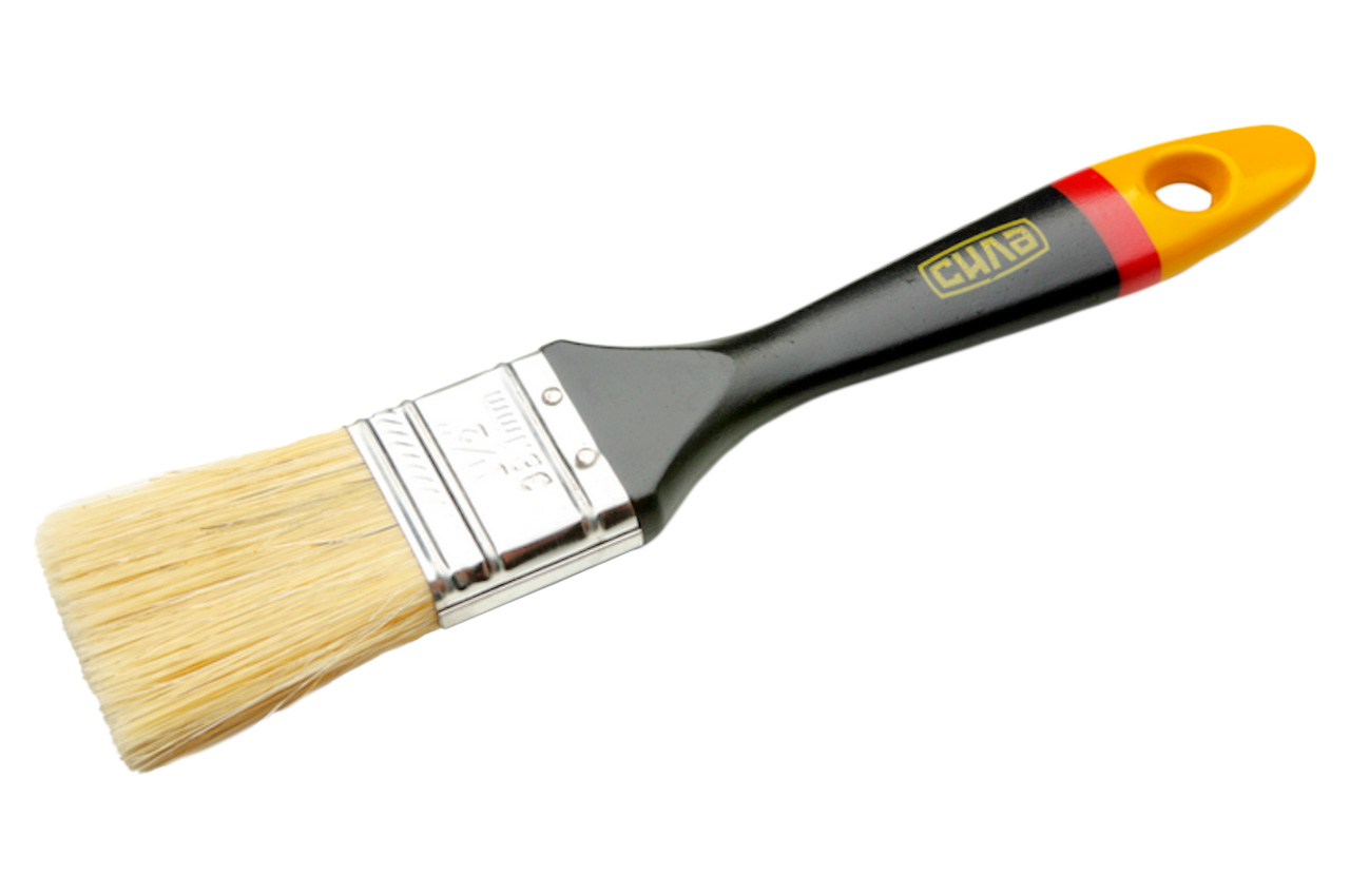 Щетина — смешанная (микс) натуральная + искусственная. Такая щетина подходит для использования с любыми красками и лаками, но при длительном использовании с ЛКМ на агрессивной основе (например, на пару дней оставили кисть в банке с растворителем) кисть теряет свои свойства (выпадает щетина). Смешанная щетина достаточно мягкая и тонкая, поэтому можно добиться идеально тонкого и ровного слоя краски. Крепление щетины - «юбка» изготовлена из качественного нержавеющего метала, закреплена к рукоятке в 4-х местах специальными гвоздями. Рукоятка — изготовлена из пластика, имеет 3-х цветную окраску (черный, желтый, красный) есть отверстие для подвешивания. Длина щетины: 44 мм; Материал рукоятки: деревянная; Материал щетины: натуральный, искусственный; Толщина щетины: 12 мм