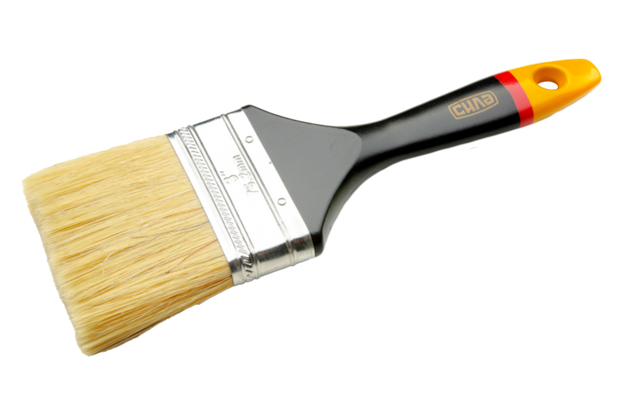 Щетина — смешанная (микс) натуральная + искусственная. Такая щетина подходит для использования с любыми красками и лаками, но при длительном использовании с ЛКМ на агрессивной основе (например, на пару дней оставили кисть в банке с растворителем) кисть теряет свои свойства (выпадает щетина). Смешанная щетина достаточно мягкая и тонкая, поэтому можно добиться идеально тонкого и ровного слоя краски. Крепление щетины - «юбка» изготовлена из качественного нержавеющего метала, закреплена к рукоятке в 4-х местах специальными гвоздями. Рукоятка — изготовлена из пластика, имеет 3-х цветную окраску (черный, желтый, красный) есть отверстие для подвешивания. Длина щетины: 57 мм; Материал рукоятки: деревянная; Материал щетины: натуральный, искусственный; Толщина щетины: 16 мм