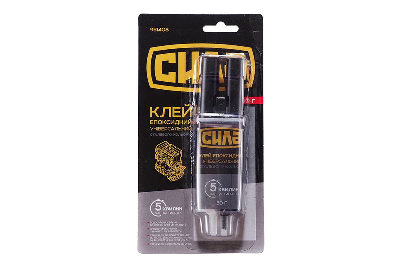 Клей эпоксидный Сила - 30г серый (шприц). Клей двухкомпонентный эпоксидный является универсальным средством для надежного склеивания различных материалов из дерева, металла, керамики, фарфора. Применяется для удаления мелких дефектов и трещин в изделиях различного состава.