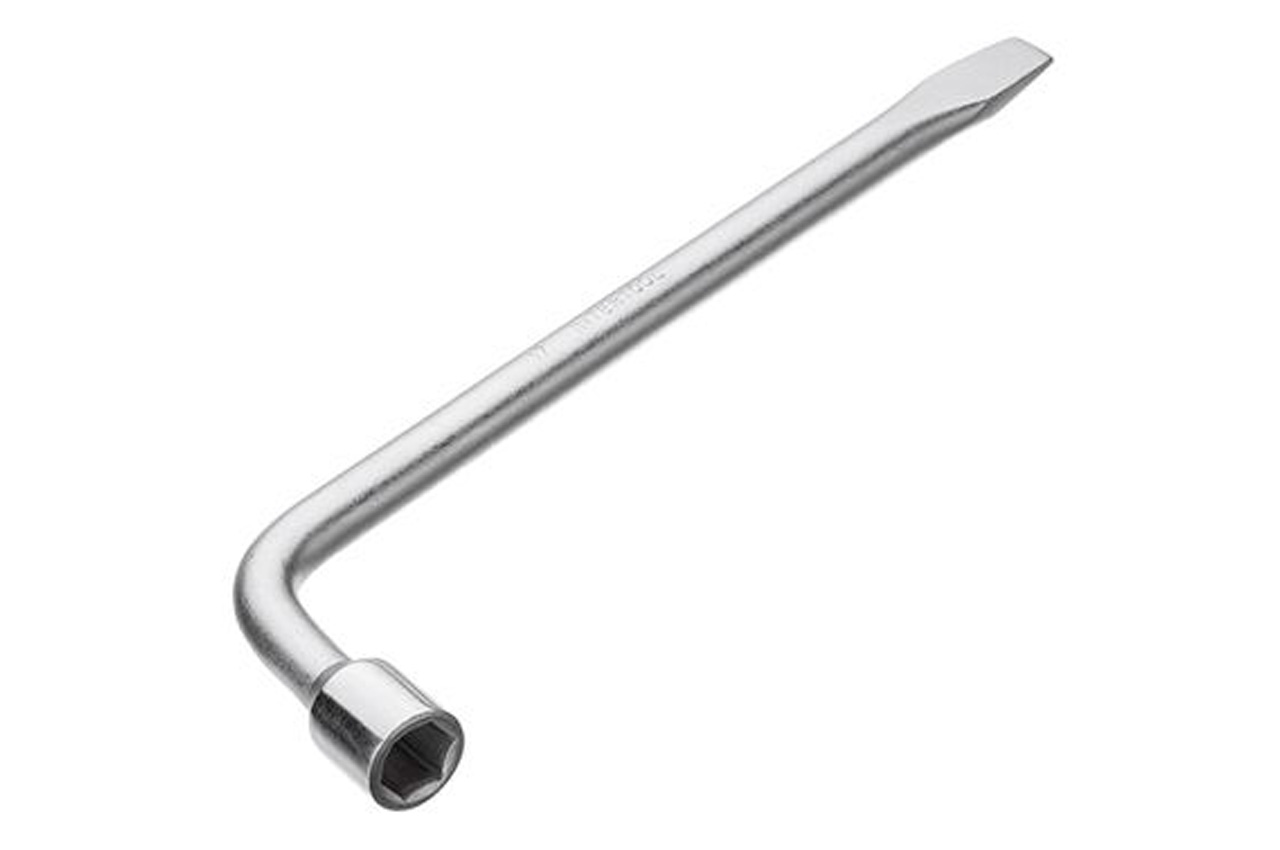 Ключ балонный L-образный. На одном конце шестигранная головка, а другой конец выполнен в виде монтировки. Размер ключа: 17 мм; Длина ключа: 350 мм