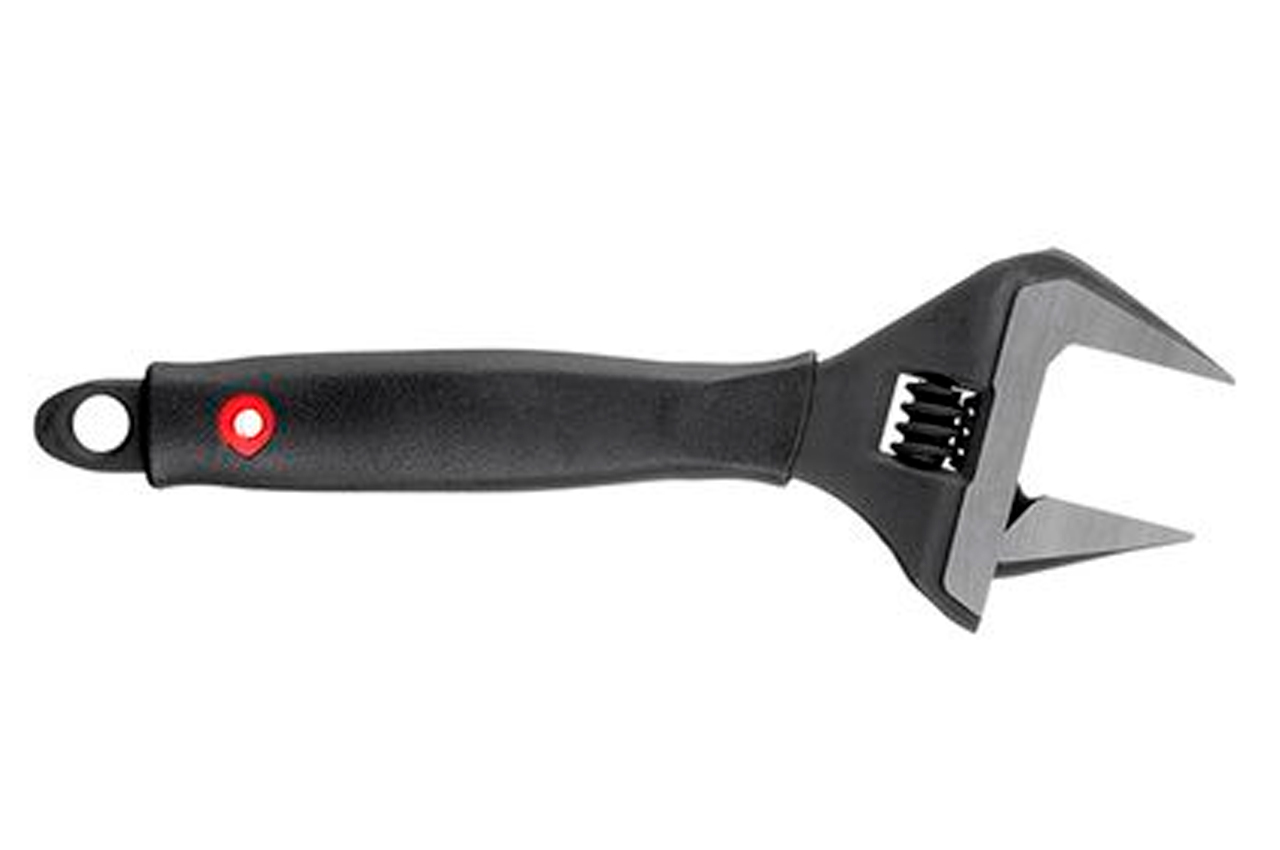 Ключ полностью изготовлен из хром-ванадиевой стали со специальным защитным покрытием темного цвета. Рукоятка дополнительно покрыта термопластичной резиной. Размер зева ключа регулируется в пределах 0-38 мм. Градуированная шкала, в виде насечек и цифр, нанесена на головку ключа. Размер: 0-38 мм; Длина ключа: 200 мм; Покрытие рукоятки: термопластичная резина
