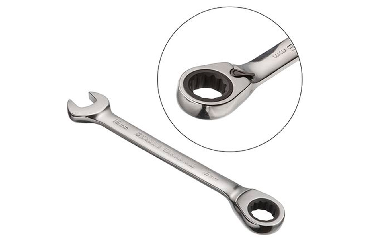 Комбинированный ключ с трещоткой и реверсом, размером 16 мм предназначен для монтажа и демонтажа резьбовых соединений гаек и болтов. Ключ изготовлен из прочной Cr-V стали. Поверхность ключа хромирована и защищает от коррозии, а также поверхность легко очищается от загрязнений. Накидок с храповым механизмом и 72 зубцами, обеспечивает мягкость хода и высокий крутящий момент. Механизм с шагом в 5° позволяет работать в узких и труднодоступных местах.