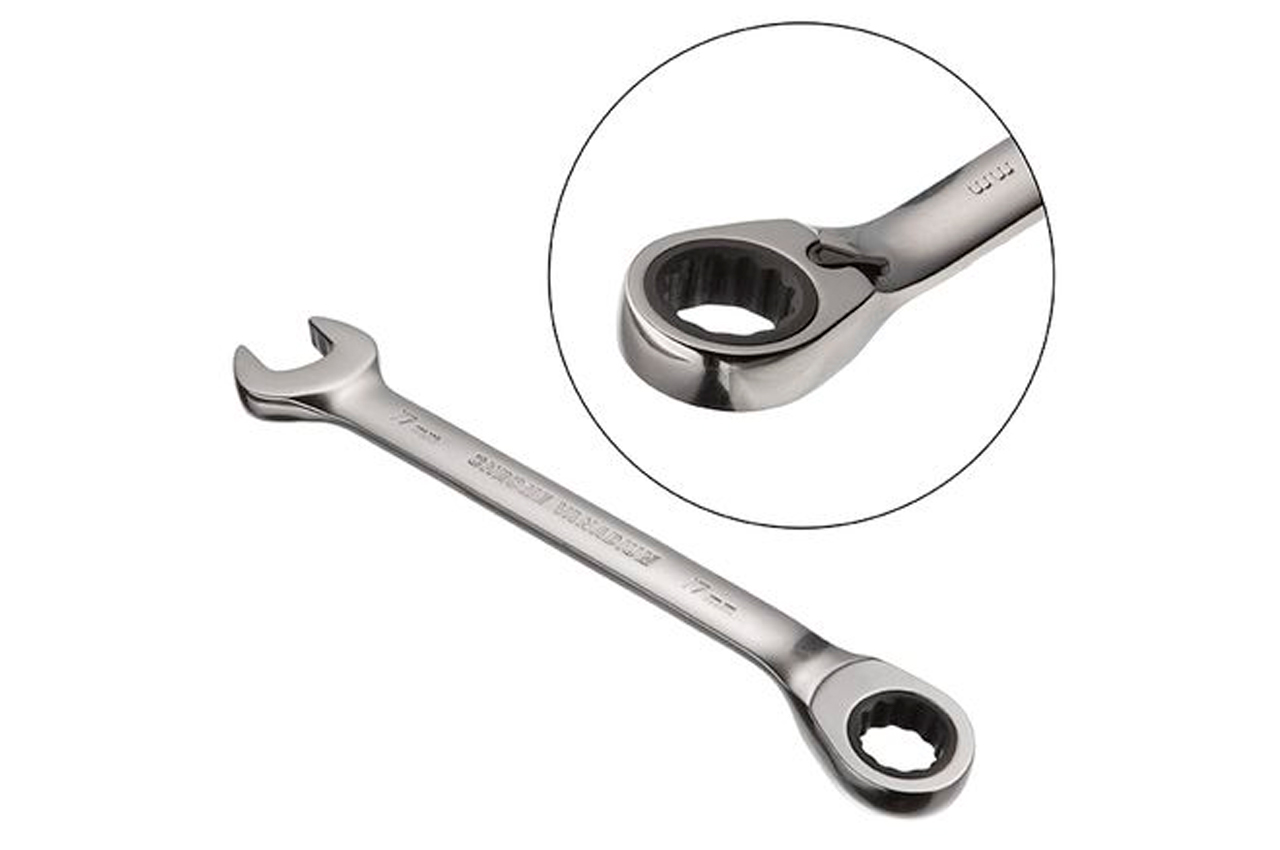 Комбинированный ключ с трещоткой и реверсом, размером 17 мм предназначен для монтажа и демонтажа резьбовых соединений гаек и болтов. Ключ изготовлен из прочной Cr-V стали. Поверхность ключа хромирована и защищает от коррозии, а также поверхность легко очищается от загрязнений. Накидок с храповым механизмом и 72 зубцами, обеспечивает мягкость хода и высокий крутящий момент. Механизм с шагом в 5° позволяет работать в узких и труднодоступных местах.