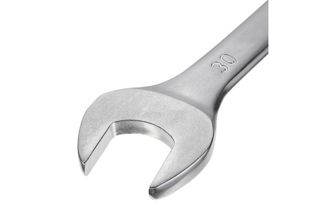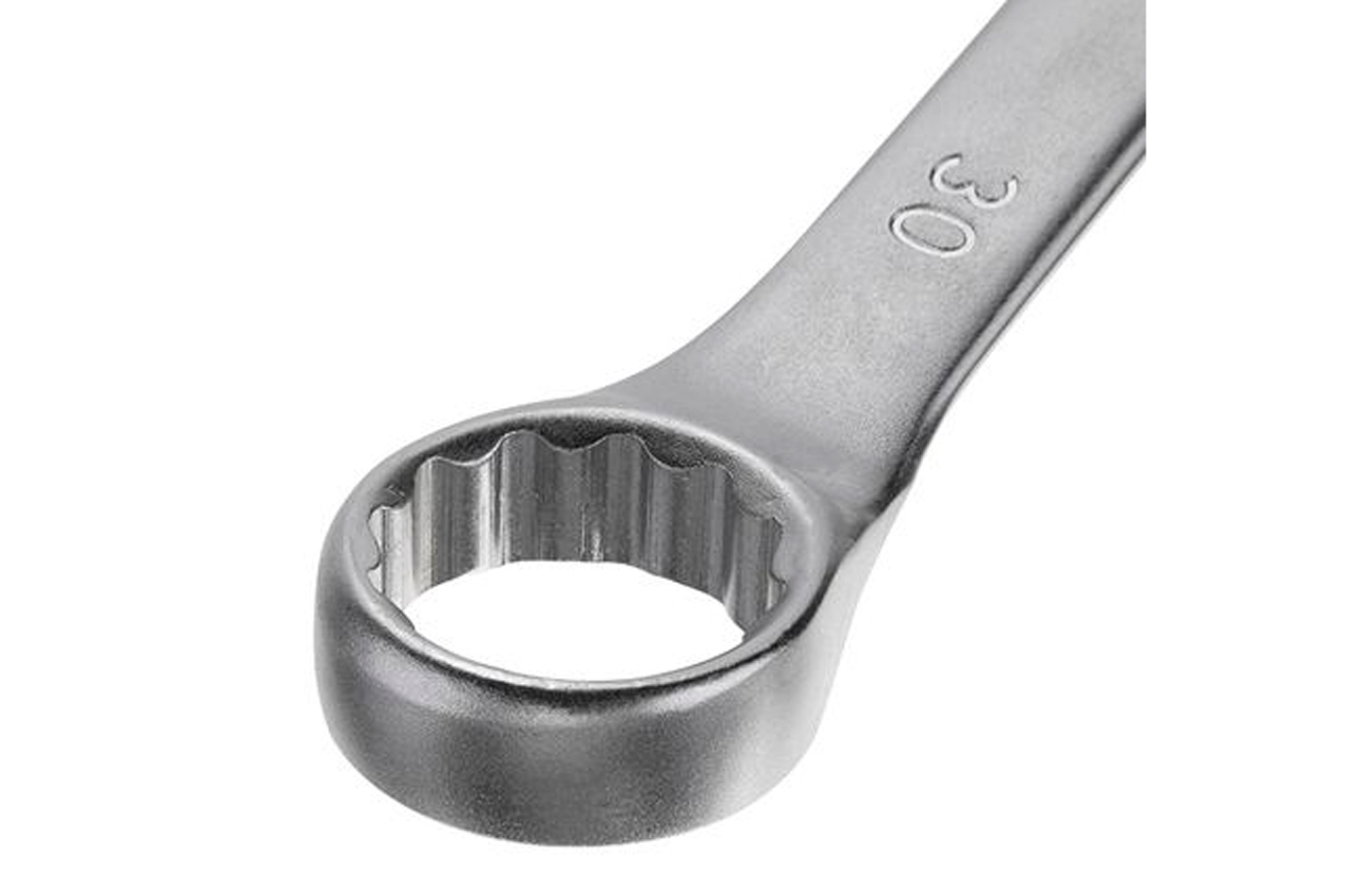 Ключ комбинированный. Это качественное сочетание двух наиболее распространенных видов ключей - гаечного и рожкового. Обе головки имеют одинаковый размер. Ключ изготавливается из легированного хромванадиевого сплава, что обеспечивает высокие эксплуатационные характеристики. Сатин-хромовое покрытие надежно защищает инструмент от коррозии. Размер ключа: 30 мм