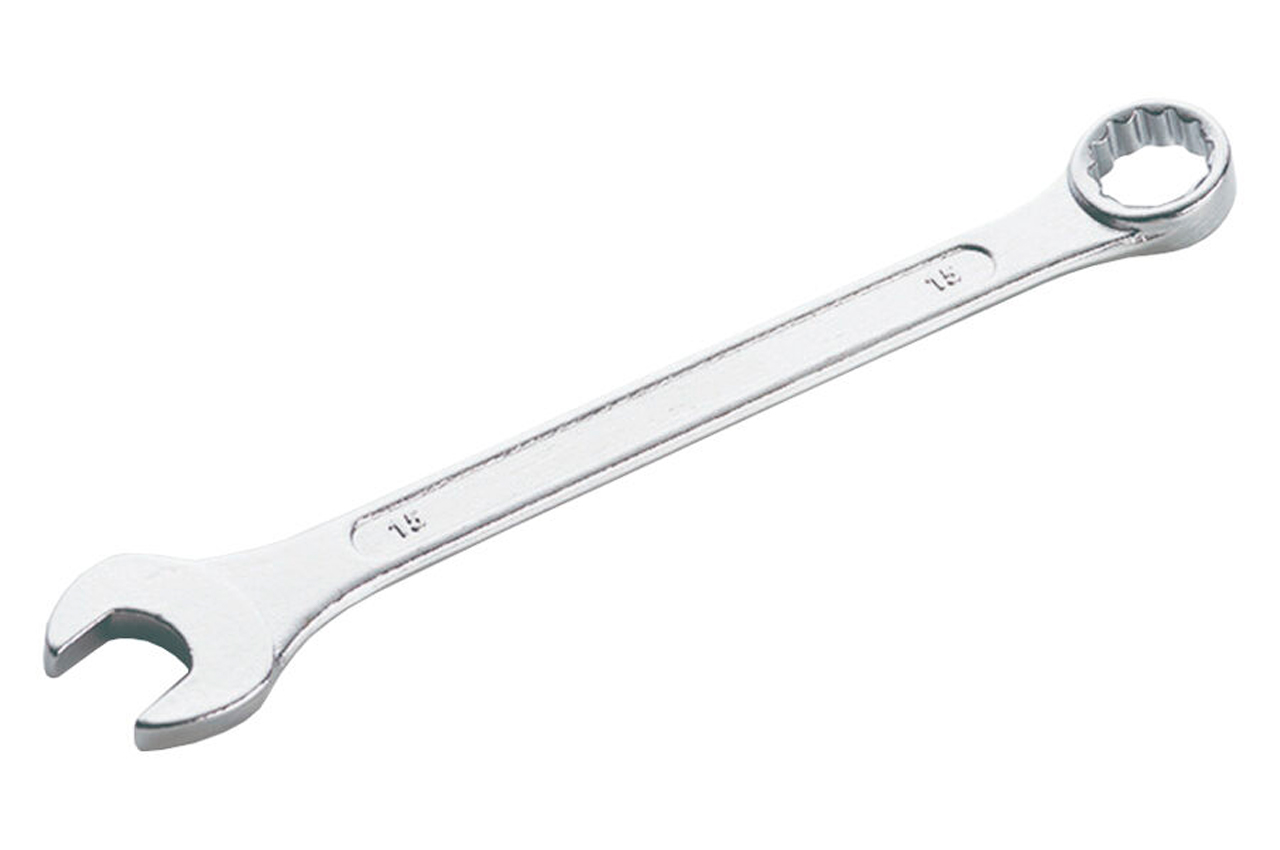 Ключ комбинированный. Это качественное сочетание двух наиболее распространенных видов ключей - гаечного и рожкового. Обе головки имеют одинаковый размер. Ключ изготавливается из легированного хромванадиевого сплава, что обеспечивает высокие эксплуатационные характеристики.