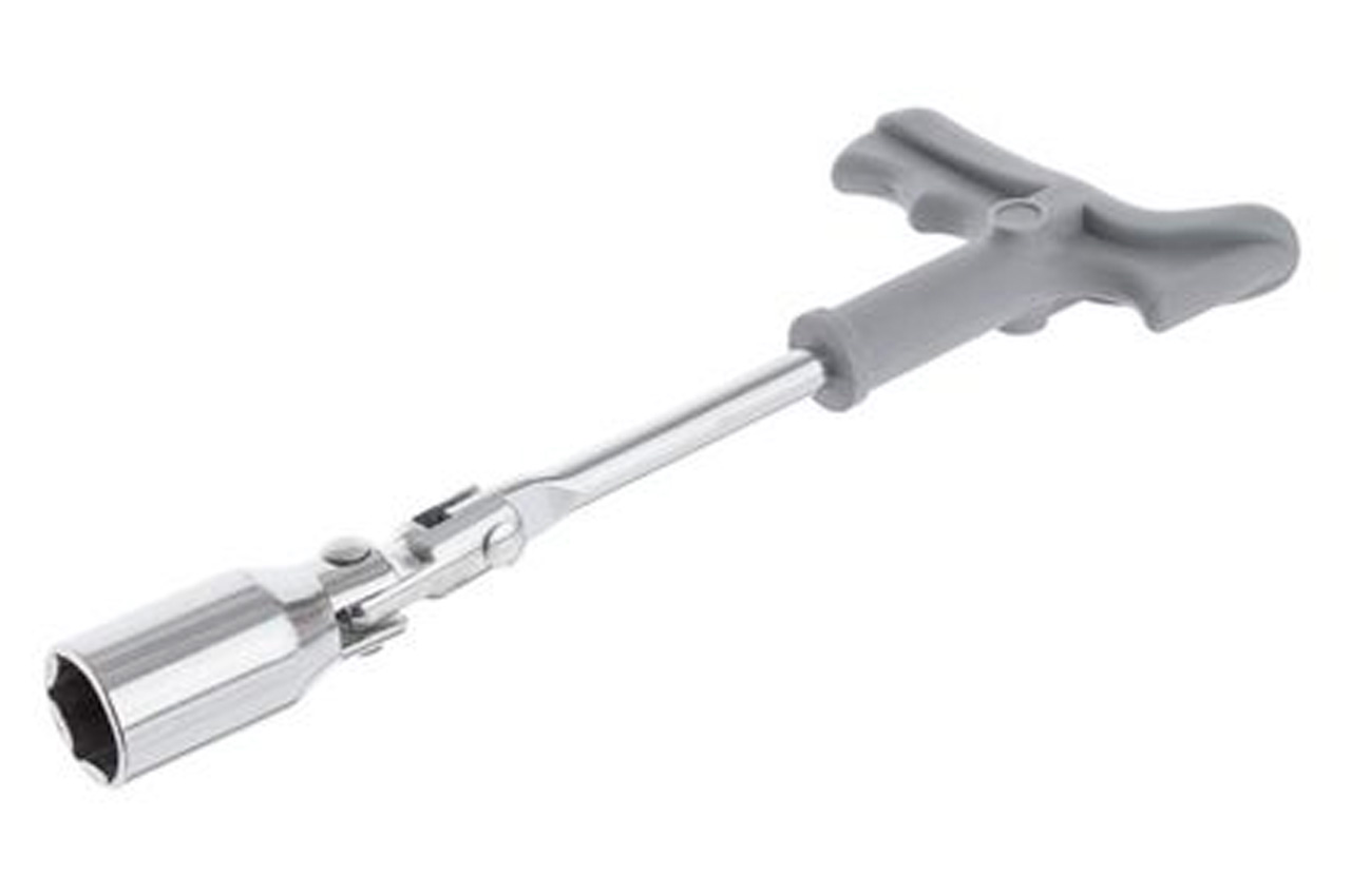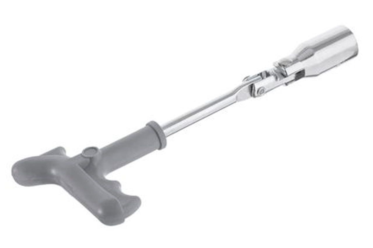 Инструмент применяется при установке и снятии свечей зажигания на машинах с бензиновыми моторами. Имеет Т-образную форму и шарнир.