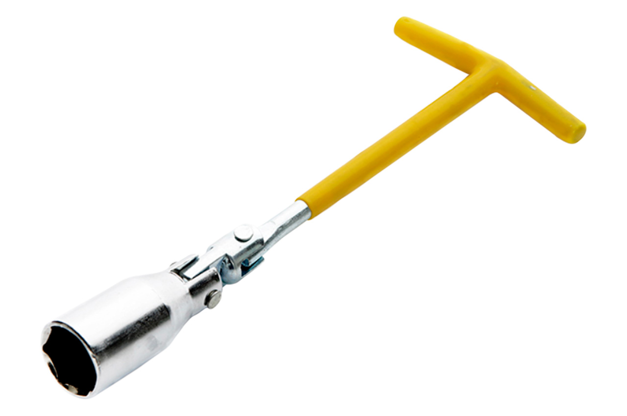 Ключ свечной. Инструмент применяется при установке и снятии свеч зажигания на машинах с бензиновыми моторами. Имеет Т-образную форму и шарнир. Материал рукоятки: термопластичная резина Материал: хром-ванадиевая сталь.