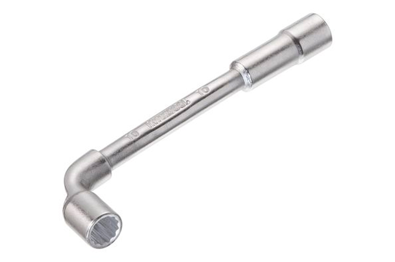 Ключ торцевой с отверстием L-образной формы. Обе головки имеют одинаковый размер (длинный конец имеет 6 граней, а короткий 12). Размер ключа: 10 мм