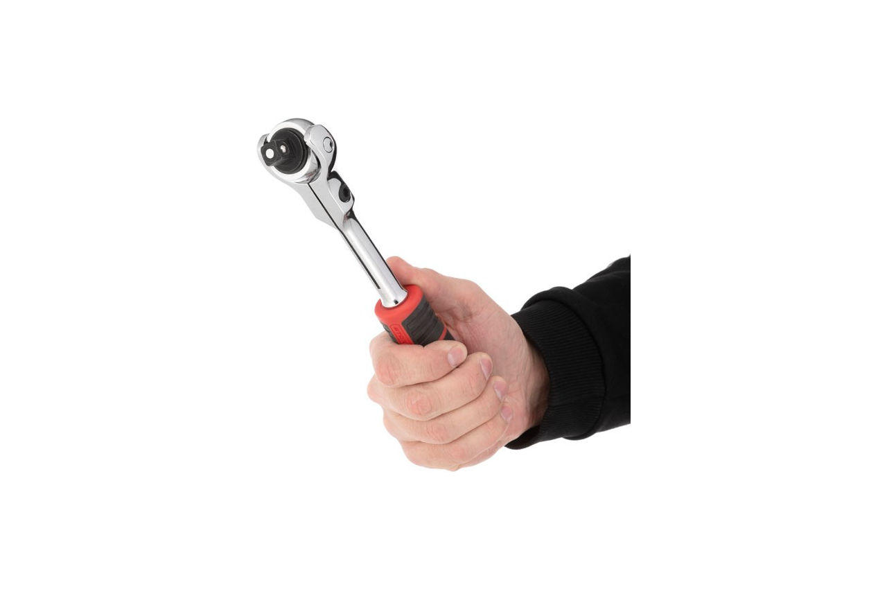 Трещотка поворотная предназначена для различных монтажно-слесарных работ, применяется для закручивания и откручивания резьбовых соединений. Работает в комплексе не только с торцевыми головками, но и с удлинителями, воротками и другими инструментами. Размер присоединительного квадрата – 1/2" Выносливая, износостойкая Cr-V сталь Трещотка изготовлена из Сr-V стали, которая гарантирует исключительную прочность и стойкость к износу. Два слоя никелевого покрытия уберегут инструмент от коррозии и во множество раз продлят срок службы инструмента. Все детали храпового механизма изготовлены в Тайване, отличаются надежностью и плавностью хода. 72 зуба с мелким шагом обеспечивает высокий крутящий момент. Эффективная работа Поворотная голова трещотки позволяет эффективно работать в труднодоступных местах и в ограниченном пространстве под любым углом. Наличие реверса и быстрая смена головок упрощают работу во множество раз! Кнопка на верхней части трещотки приводит фиксирующий шарик в действие и вы с легкостью можете менять головки, при этом насадки прочно сидят на посадочном квадрате трещотки и не спадают. Удобная ручка Форма ручки трещотки обеспечивает максимальную эффективность от приложенного усилия. Трехкомпонентная рукоятка изготовлена из термопластичной резины (TPR) и гарантирует надежное сцепление даже с грязными или испачканными в масле руками. Легкая, прочная, бензомаслостойкая ручка удобно лежит в ладони во время работы. Квадрат: 1/2"; Особенности: поворотная