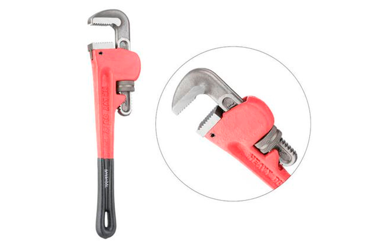Ключ трубный тип Stillson применяется для ремонтно-сантехнических работ, в тех местах, где трубы скреплены между собой при помощи резьбовых соединений. Губки расположены под углом 90° по отношению к ручкам. Диаметр захвата регулируется за счет подвижного верхнего рычага. Изготовлен из высококачественной инструментальной стали. Эргономичная прорезиненная рукоятка. Максимальная ширина захвата: 55 мм