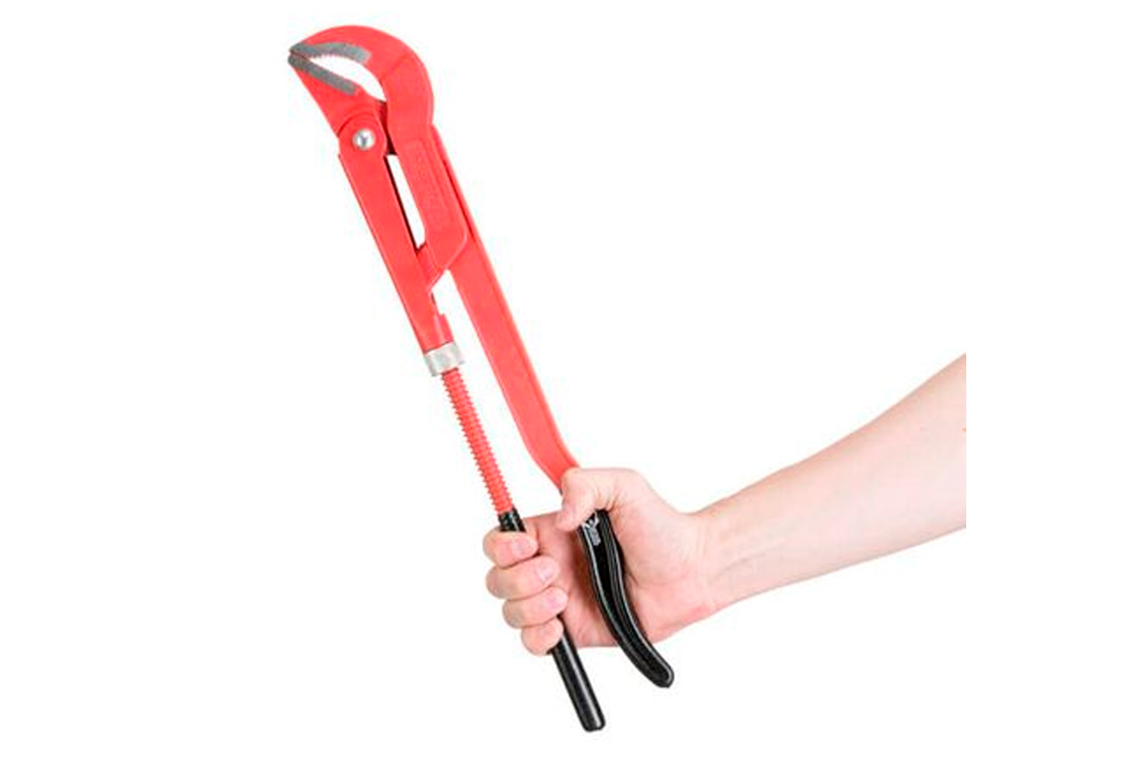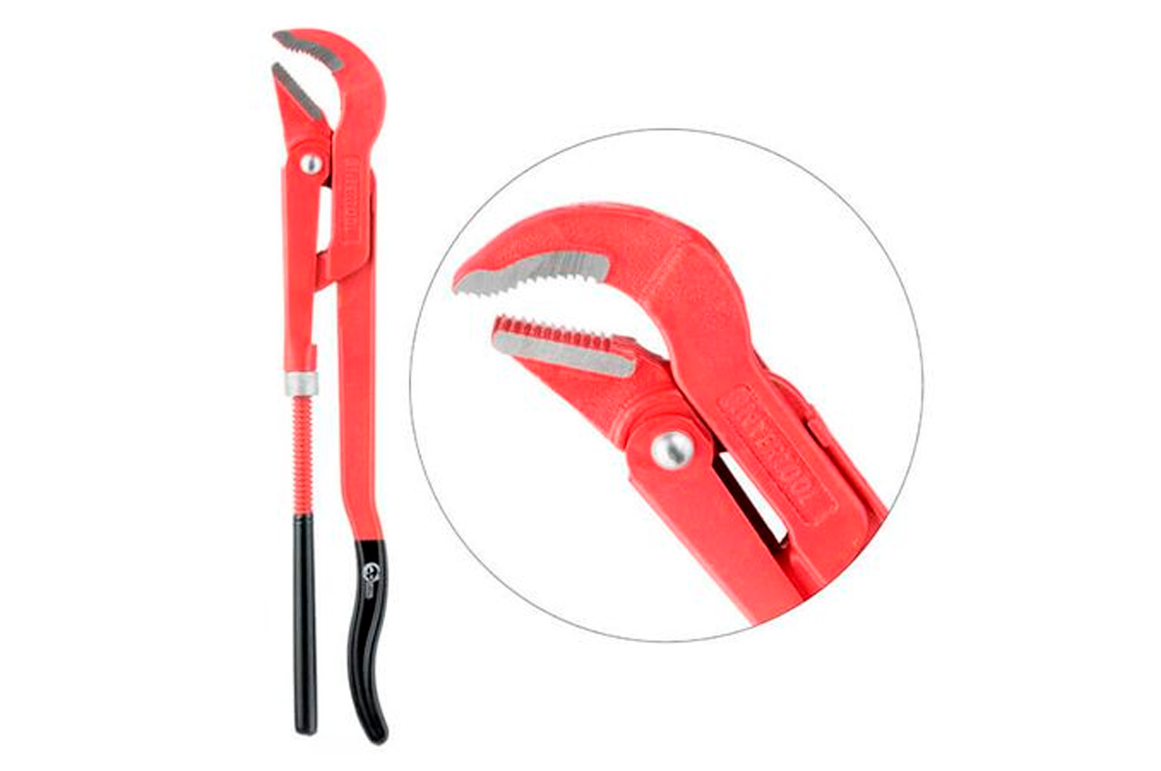 Применяется практически во всех видах ремонтно-сантехнических работ. Губки расположены под углом 45° к ручкам. Диаметр захвата регулируется за счет подвижного нижнего рычага. Изготовлен из высококачественной инструментальной стали, что гарантирует высокую износостойкость и защиту от коррозии в процессе работы. Эргономичная прорезиненная рукоятка обеспечивает удобство захвата инструмента. Размеры: 2"