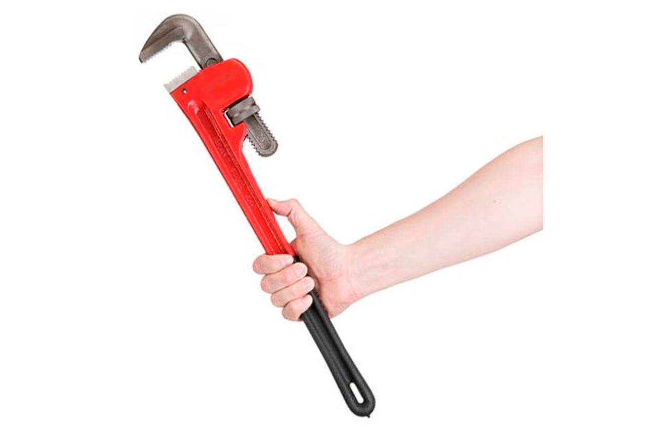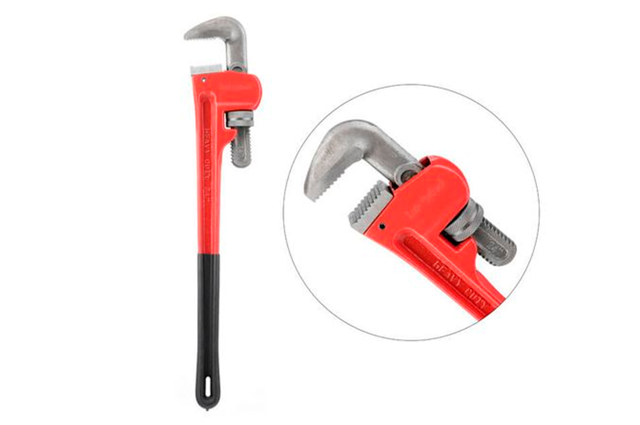 Ключ трубный тип Stillson применяется для ремонтно-сантехнических работ, в тех местах, где трубы скреплены между собой при помощи резьбовых соединений. Губки расположены под углом 90° по отношению к ручкам. Диаметр захвата регулируется за счет подвижного верхнего рычага. Изготовлен из высококачественной инструментальной стали. Эргономичная прорезиненная рукоятка. Максимальная ширина захвата: 90 мм