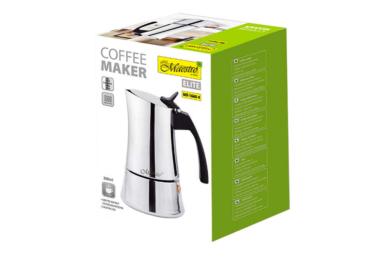 Принцип работы гейзерной кофеварки Maestro прост: пар в нижней части достигает высокого давления и постепенно вытесняет кипящую воду через лейку и фильтр, в котором находится молотый кофе. Вода проходит через молотый кофе и попадает в верхний резервуар, где собирается готовый напиток. Кофе, приготовленный этим способом, получается ароматным и насыщенным. Рассчитана на 4 чашки кофе.