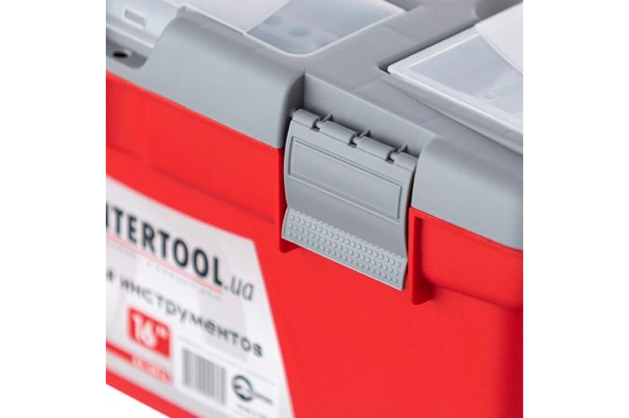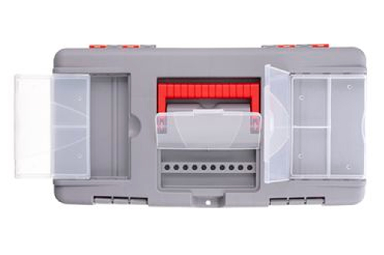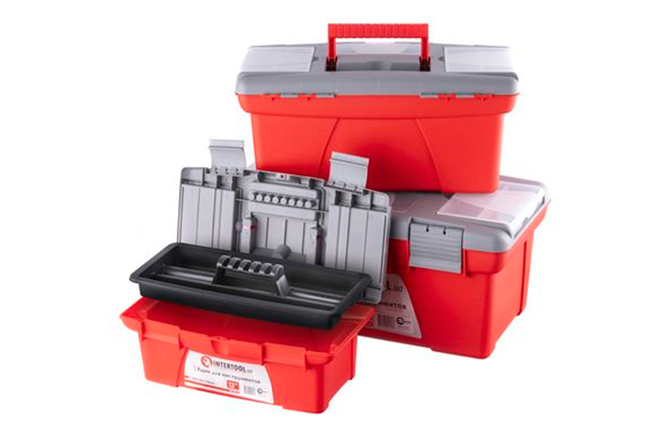 Ящики (13, 16 и 18") для хранения и безопасной транспортировки инструмента изготовлены из прочного пластика, имеют прочную ручку и устойчивы к внешним механическим воздействиям. Ящики имеют пластиковые замки и дополнительные пластиковые боксы на крышке. Два бокса - съемные, необходимы для хранения мелких деталей, расходных материалов и т.д. А третий бокс, расположенный на передней части крышке ящика имеет дополнительные отверстия для бит (отверточных насадок), головок.