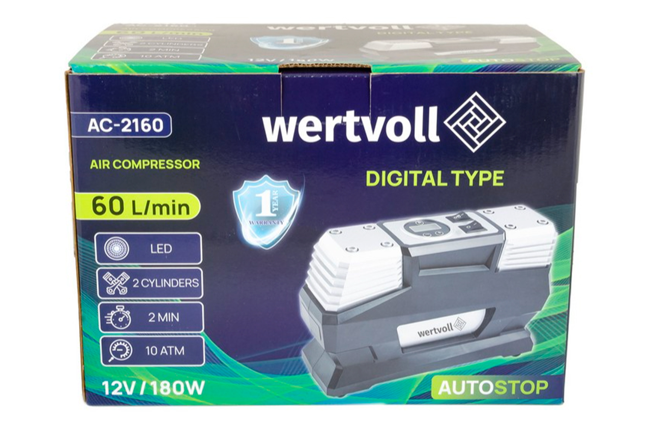 Компрессор автомобильный двухпоршневой Wertvoll - 180Вт x 85л/мин