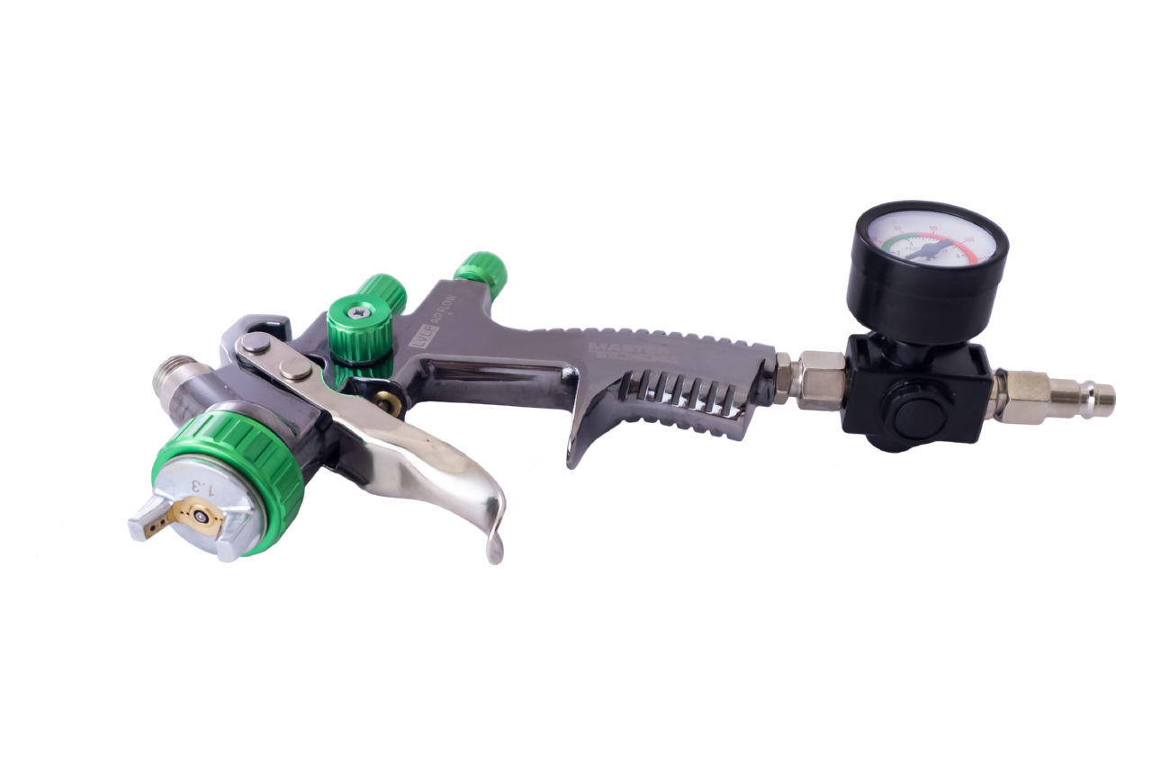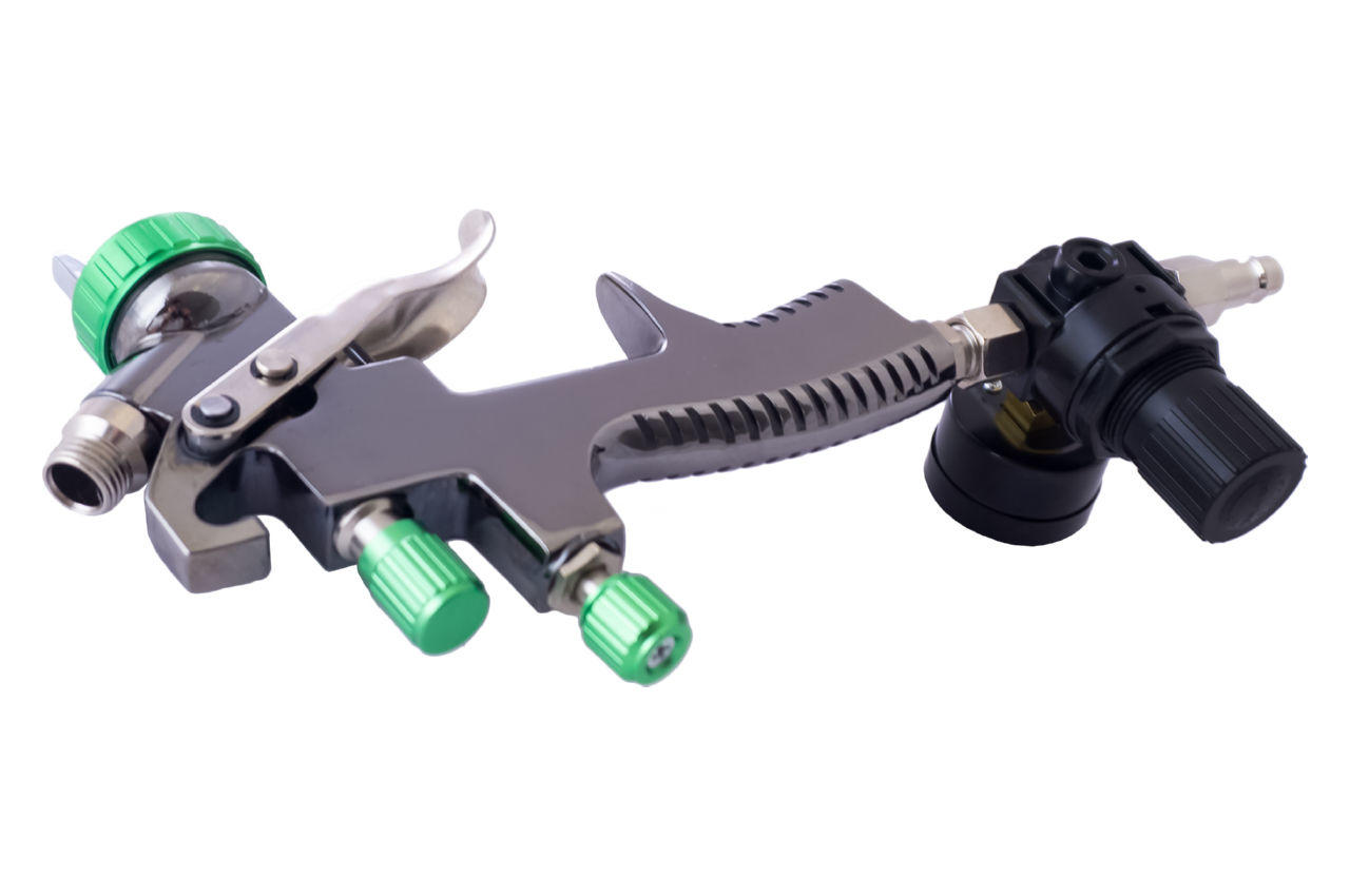 Технология распыления LVLP пластиковый верхний бачок 600 см3 форсунка 1,3 мм рабочее давление 1,5 - 2,5 bar производительность компрессора 125 - 170 л / мин диаметр круглого факела 30 - 50 мм ширина плоского факела 140 - 260 мм регулятор подачи ЛКМ регулятор формы факела регулятор подачи воздуха редуктор с манометром переходник 1/4 '' - быстросъемное соединение.