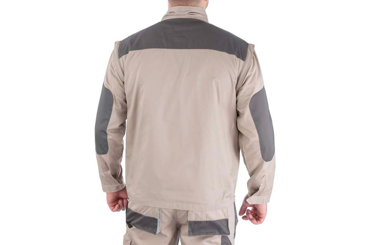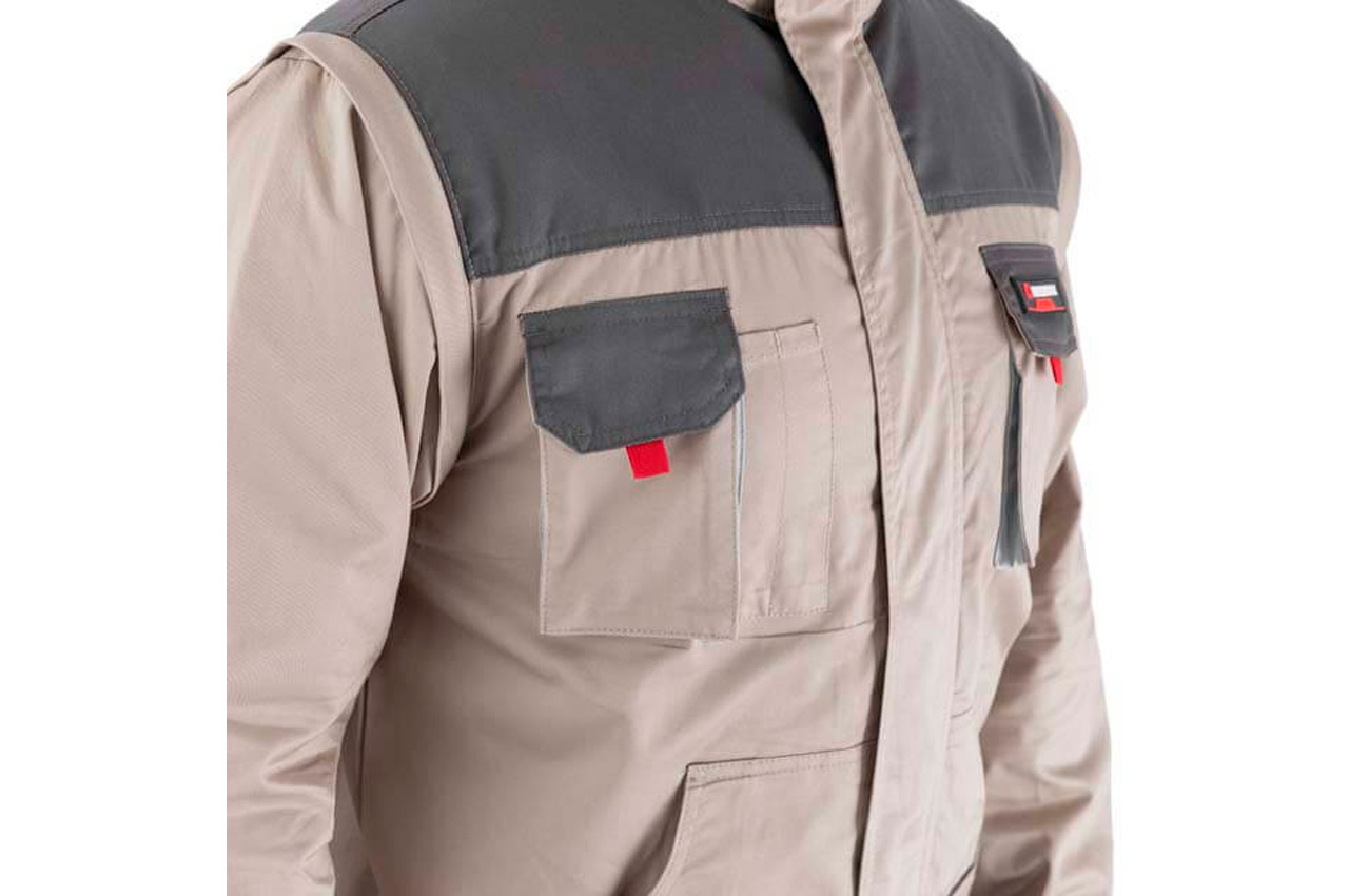 Куртка бежевого цвета производится из 100% натурального хлопка с высоким уровнем гигиеничности и прочности (плотность 180 г/м²). Изделие отлично пропускает воздух и не создает дискомфорта при интенсивной работе, при этом защищает от всевозможных механических воздействий окружающей среды. При необходимости, в жаркой среде может трансформироваться в рабочий жилет, рукава отстегиваются. 7 функциональных карманов для хранения инструмента и личных вещей Молния с ветрозащитным клапаном Комфортный, легкий материал изготовления Накладки из плотной ткани на локтях для защиты от истирания Усиленные швы повышают прочность изделия Манжет на липучке Трансформируется в рабочий жилет - рукава на змейке Прямой крой куртки не сковывает движений