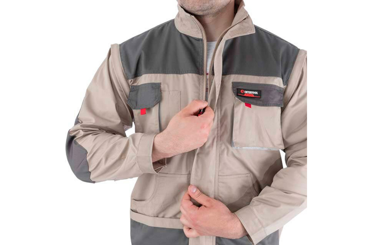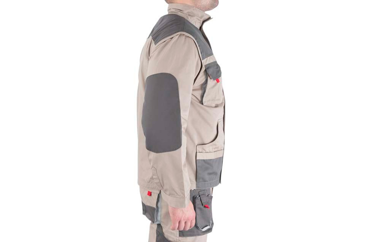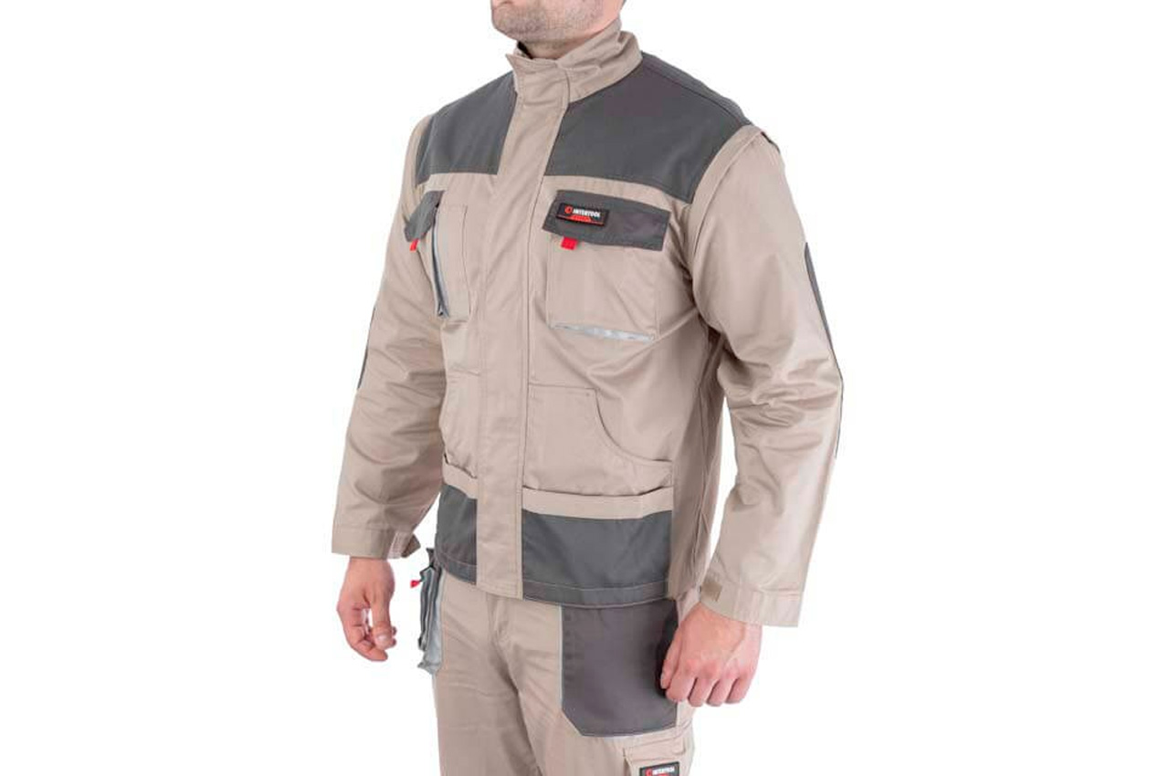 Куртка бежевого цвета производится из 100% натурального хлопка с высоким уровнем гигиеничности и прочности (плотность 180 г/м²). Изделие отлично пропускает воздух и не создает дискомфорта при интенсивной работе, при этом защищает от всевозможных механических воздействий окружающей среды. При необходимости, в жаркой среде может трансформироваться в рабочий жилет, рукава отстегиваются. 7 функциональных карманов для хранения инструмента и личных вещей Молния с ветрозащитным клапаном Комфортный, легкий материал изготовления Накладки из плотной ткани на локтях для защиты от истирания Усиленные швы повышают прочность изделия Манжет на липучке Трансформируется в рабочий жилет - рукава на змейке Прямой крой куртки не сковывает движений