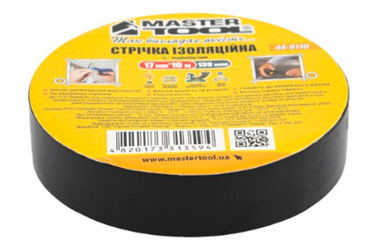 Изолента Mastertool 10 метров черная в интернет-магазине «Цилиндр» предназначена для изолирования жил токопроводящих проводов и кабелей напряжением до 1000В, а также с целью их фиксирования, герметичной защиты отводов и соединений. Изготовлена из ПВХ. Лента изоляционная черного цвета, что удобно для изоляции разноцветных проводов. Ее длина составляет 10 метров, а толщина 0,15 мм. Ширина изоленты 17 мм. Внутренняя часть ленты покрыта клейким основанием, посредством которого достигается прочное и герметичное соединение токопроводящих частей. Изоленту используют не только электрики, она нужна в быту, когда необходимо устранить повреждение изоляции на кабеле или при соединении двух частей проводов. Изолента устойчива к истиранию, а также воздействию влаги, кислотам и щелочам, а также прочим видам воздействия.