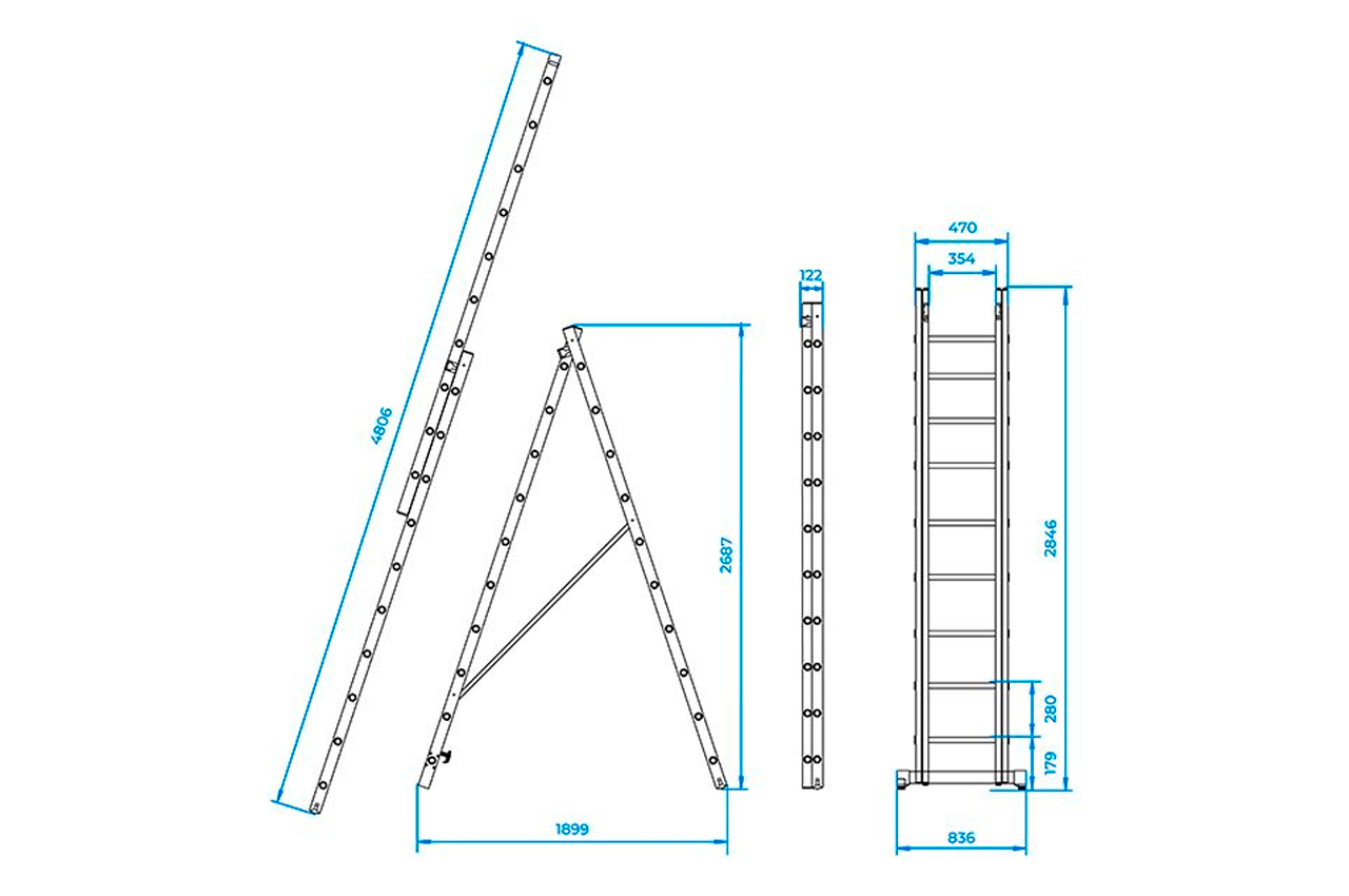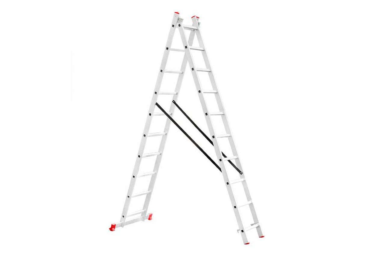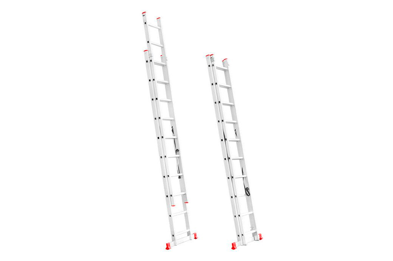 Лестница алюминиевая изготовлена из высококачественного экструдированного алюминиевого профиля, поэтому она достаточно легкая 9,8 кг и максимально надежная - выдерживает нагрузки до 150 кг. Каждая из двух секций оснащена 10 ступенями шириной 280 мм. Высота лестницы в разложенном виде 4810 мм, в сложенном 2846 мм. Оснащена противоскользящими двухкомпонентными опорными заглушками, что обеспечивает надежное сцепление с опорной поверхностью и препятствует нежелательному скольжению лестницы. Рифленые ступени предотвращают скольжение обуви. Конструкция позволяет использовать её и как стремянку и как приставную лестницу. Высота в сложенном виде: 2846 мм; Ширина лестницы: 470 мм; Количество ступеней: 10 ед.; Ширина ступени: 280 мм; Максимальная нагрузка: 150 кг