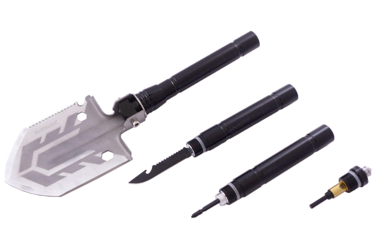 Лопата многофункциональная Рамболд - 8-в-1 M2 черная ручка представляет собой инновационную и многофункциональную разборную конструкцию, которая является истинным мультитулом. С этим компактным инструментом вы готовы к широкому спектру задач, будь то в автотуризме, охоте, кемпинге, дачном отдыхе или рыбалке.