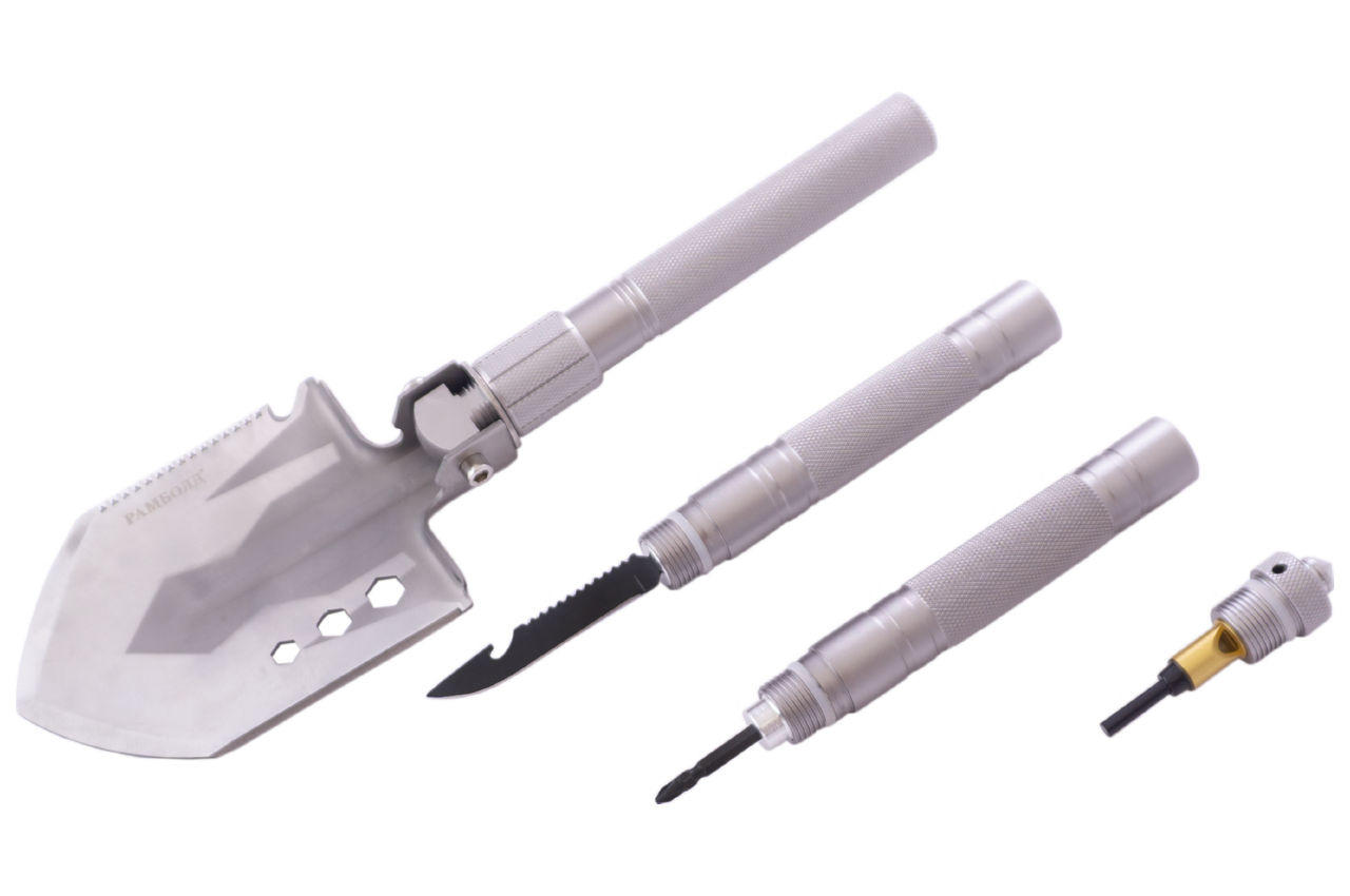 Лопата многофункциональная Рамболд - 8-в-1 M3 белая ручка представляет собой инновационную и многофункциональную разборную конструкцию, которая является истинным мультитулом. С этим компактным инструментом вы готовы к широкому спектру задач, будь то в автотуризме, охоте, кемпинге, дачном отдыхе или рыбалке.