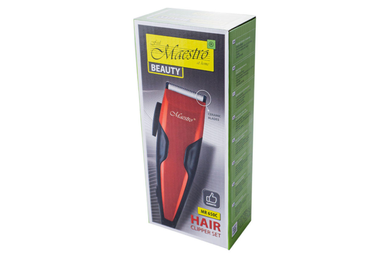 Универсальная машинка для стрижки Maestro MR-650C – отличная модель, она подойдет для домашнего использования, но ее возможности позволят с некоторыми ограничениями работать и в профессиональной сфере. Милый дизайн, современные технологии и высокое качество сочетаются в модели. В комплекте 4 насадки-гребня для стрижки 3, 6, 9, 12 мм. Для ухода за машинкой для стрижки в комплекте щеточка для очистки лезвий масло для их смазки.